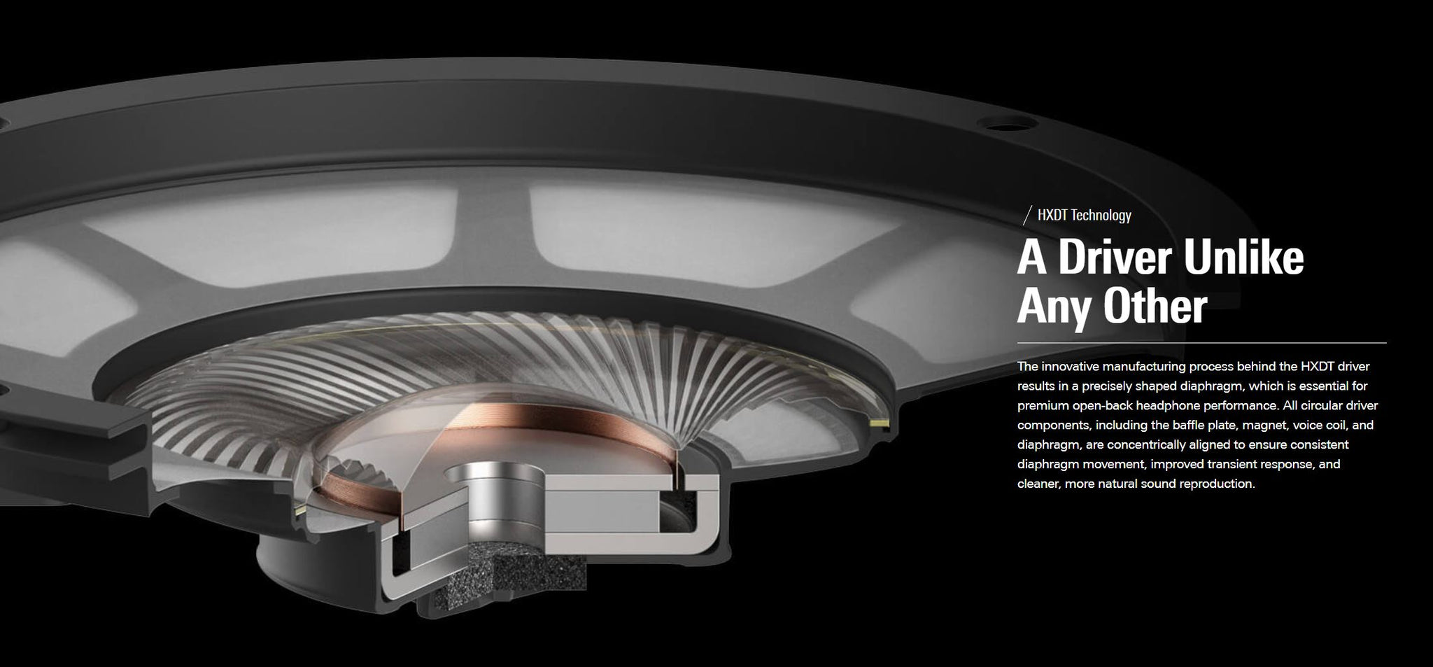 > The innovative manufacturing process behind the HXDT driver results in a precisely shaped diaphragm, which is essential for premium open-back headphone performance. All circular driver components, including the baffle plate, magnet, voice coil, and diaphragm, are concentrically aligned to ensure consistent diaphragm movement, improved transient response, and cleaner, more natural sound reproduction.