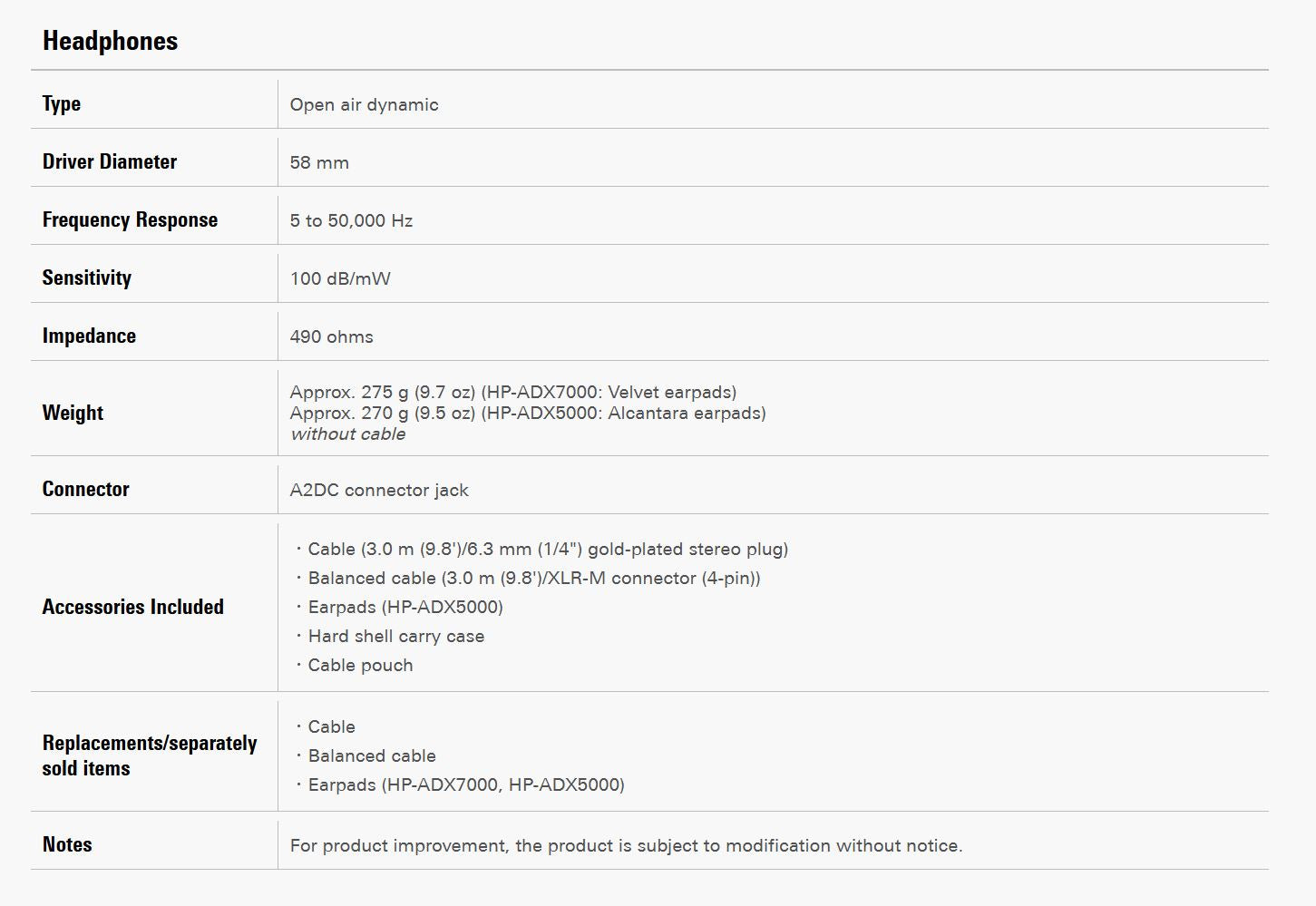 > Weight without cable: Approx. 275 g (9.7 oz) (HP-ADX7000: Velvet earpads), Approx. 270 g (9.5 oz) (HP-ADX5000: Alcantara earpads)