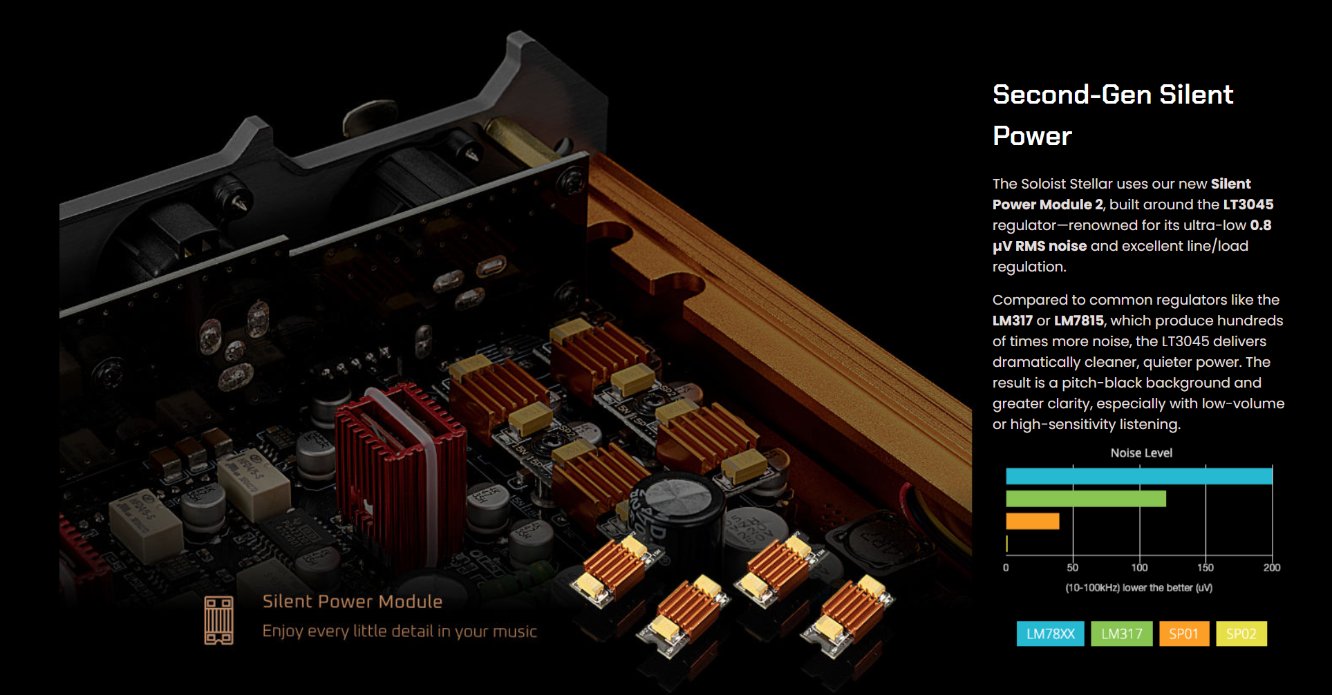 Equipped with precise components, the Soloist Stellar features NE5532 op-amps and Silent Power modules, ensuring optimal performance. The unit is tailored for users who appreciate rich detail and dynamic energy in their music. Additionally, the standard package includes a reliable 24V/5A Power Supply Unit, enhancing your listening experience.