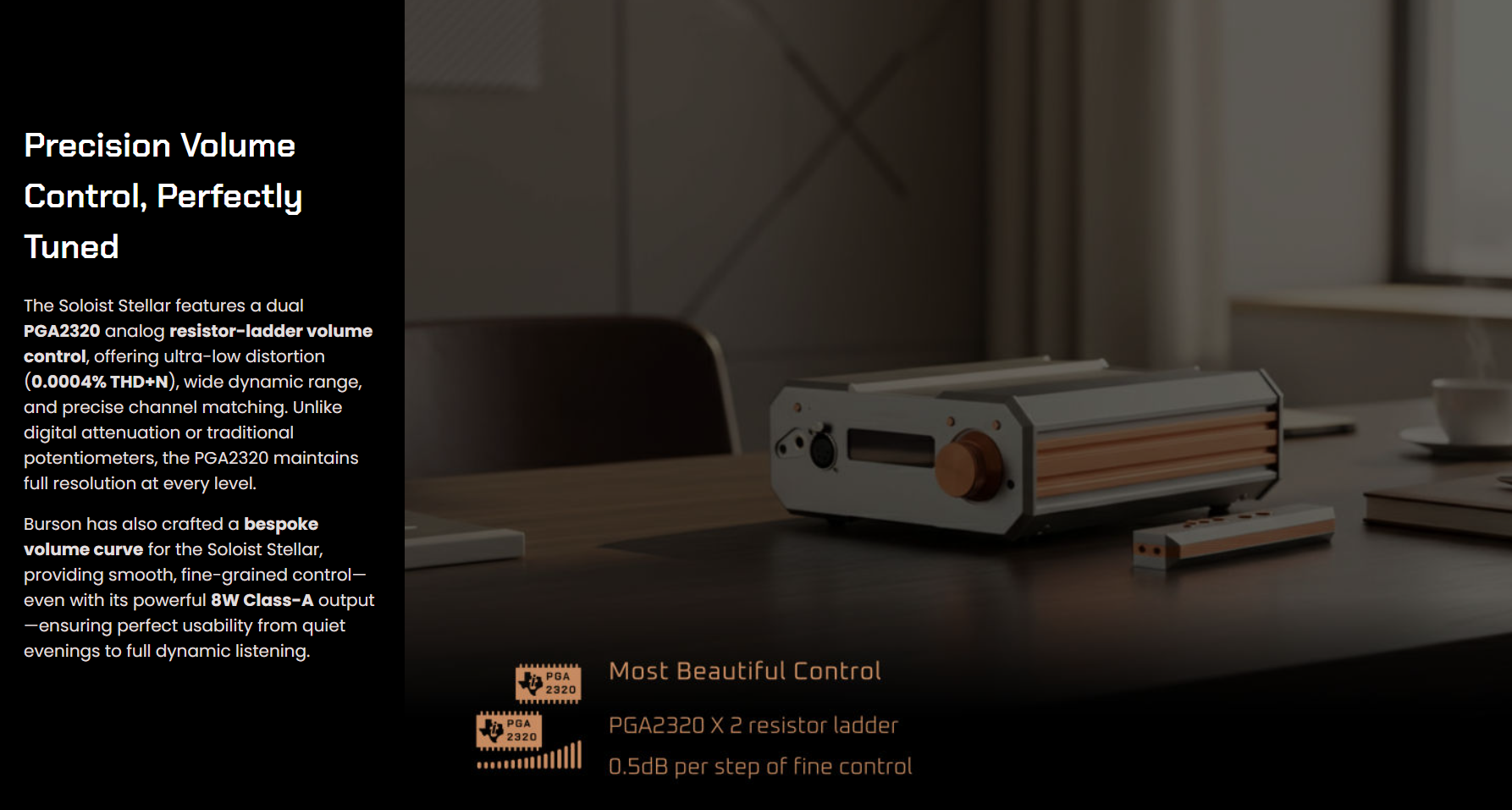 SEO KEYWORDS: Soloist Stellar, Burson audio, headphone amplifier, Class-A amplifier, audiophile equipment, XLR output, low distortion volume control, high-power headphone amp, premium sound quality, discreet amplifier.