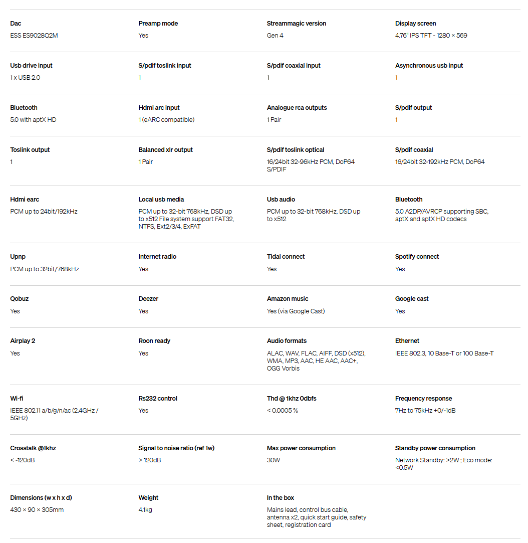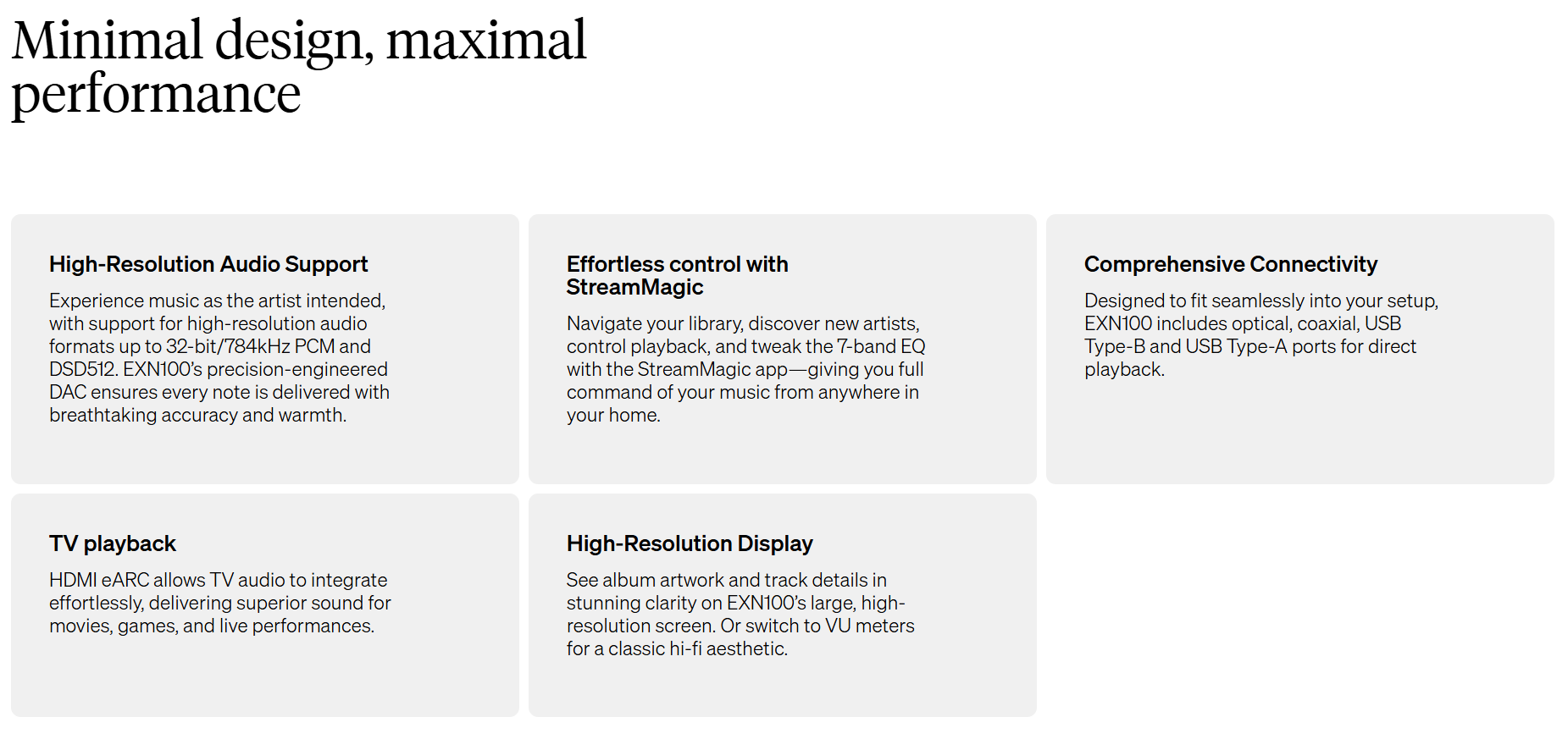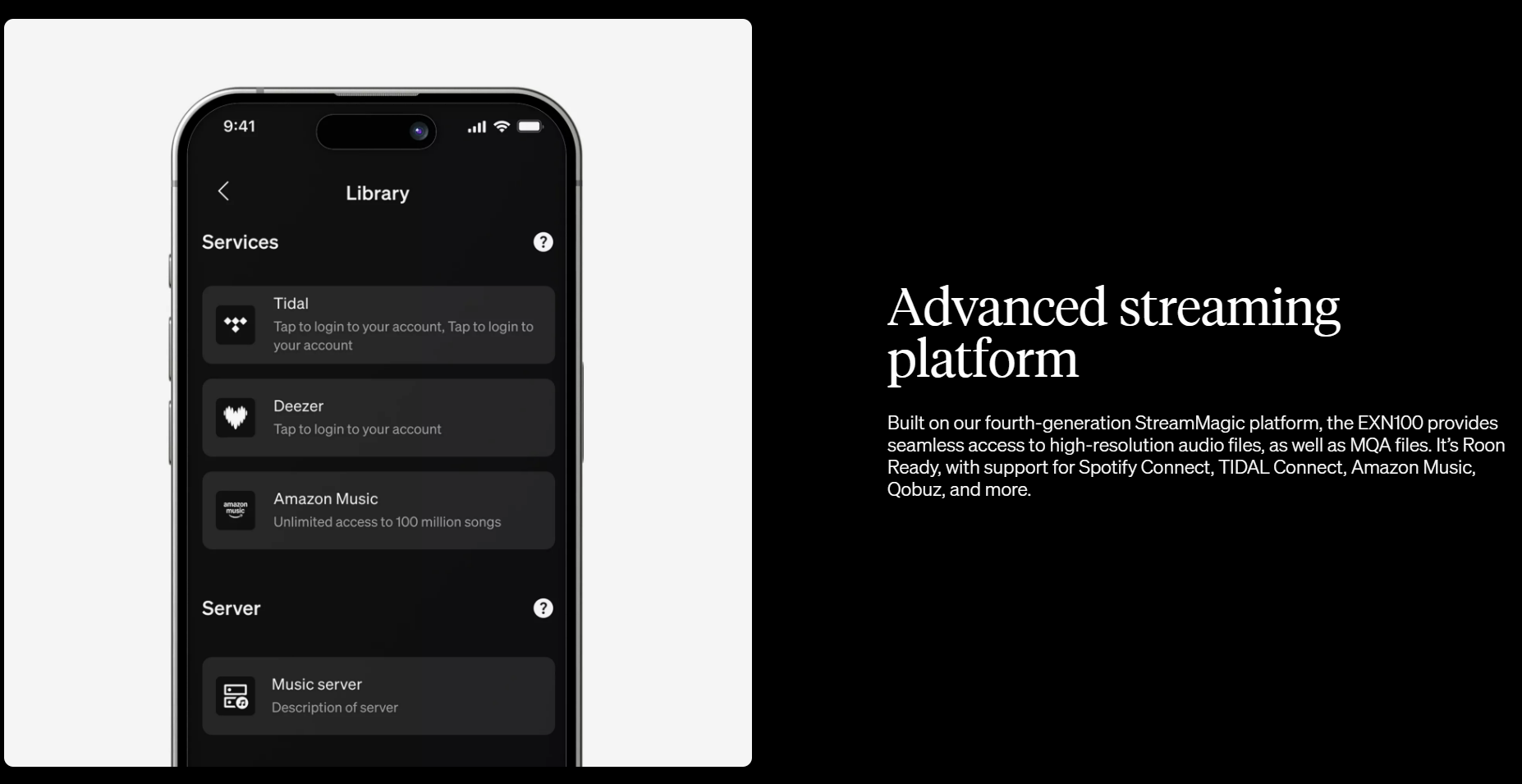 > Built on our fourth-generation StreamMagic platform, the EXN100 provides seamlesss access to high-resolution audio files, as well as MQA files. It's Roon Ready, with support for spotify Connect, TIDAL Connect, Amazon Music, Qobuz, and more.
