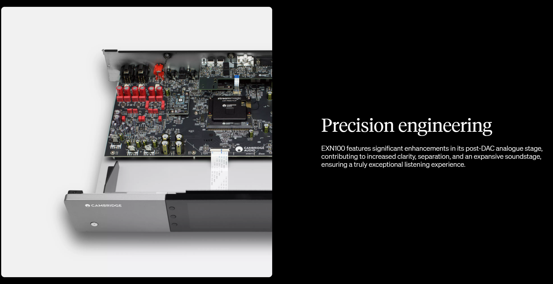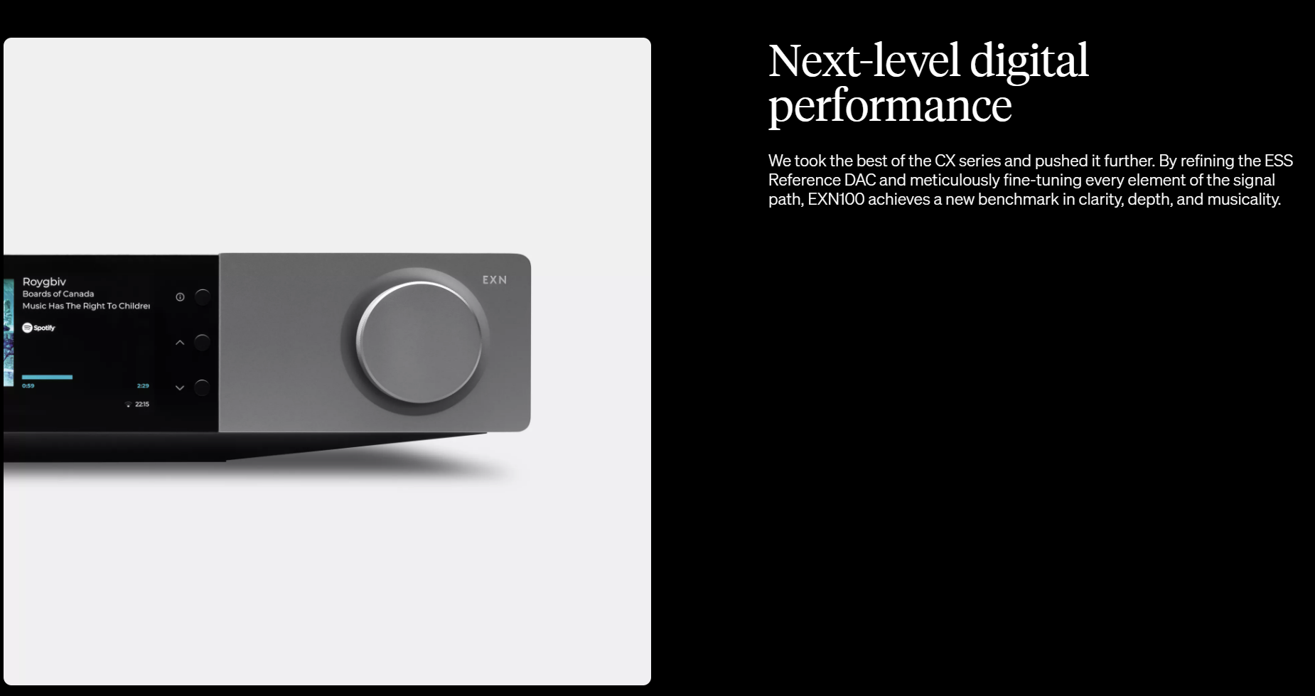 > We took the best of the CX series and pushed it further. By refining the ESS Reference DAC and meticulously fine-tuning every element of the signal path, EXN100 achieves a new benchmark in clarity, depth, and musicality.