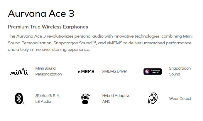 SEO KEYWORDS: Aurvana Ace 3, True Wireless Earphones, Bluetooth 5.4, xMEMS Drivers, Hybrid ANC, Mimi Sound Personalization, Snapdragon Sound, Earbuds, High Resolution Audio, Water-resistant Earphones
