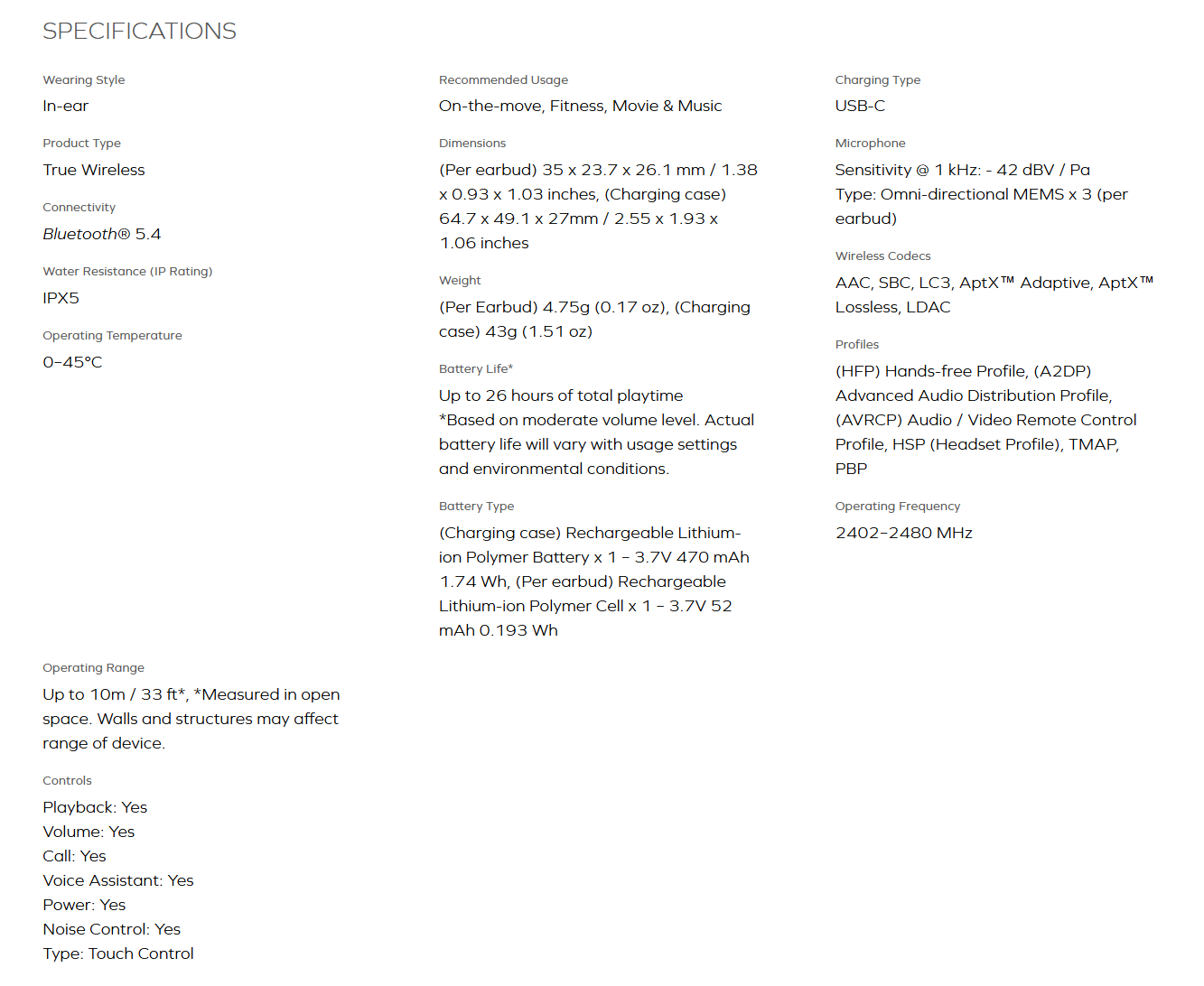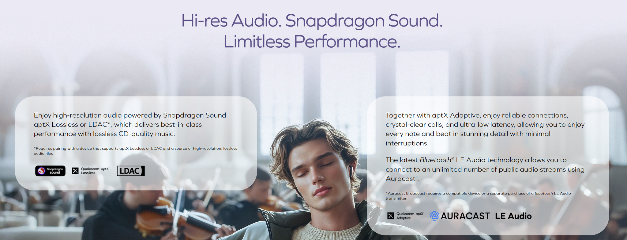 Wireless Codecs: AAC, SBC, LC3, AptX™ Adaptive, AptX™ Lossless, LDAC