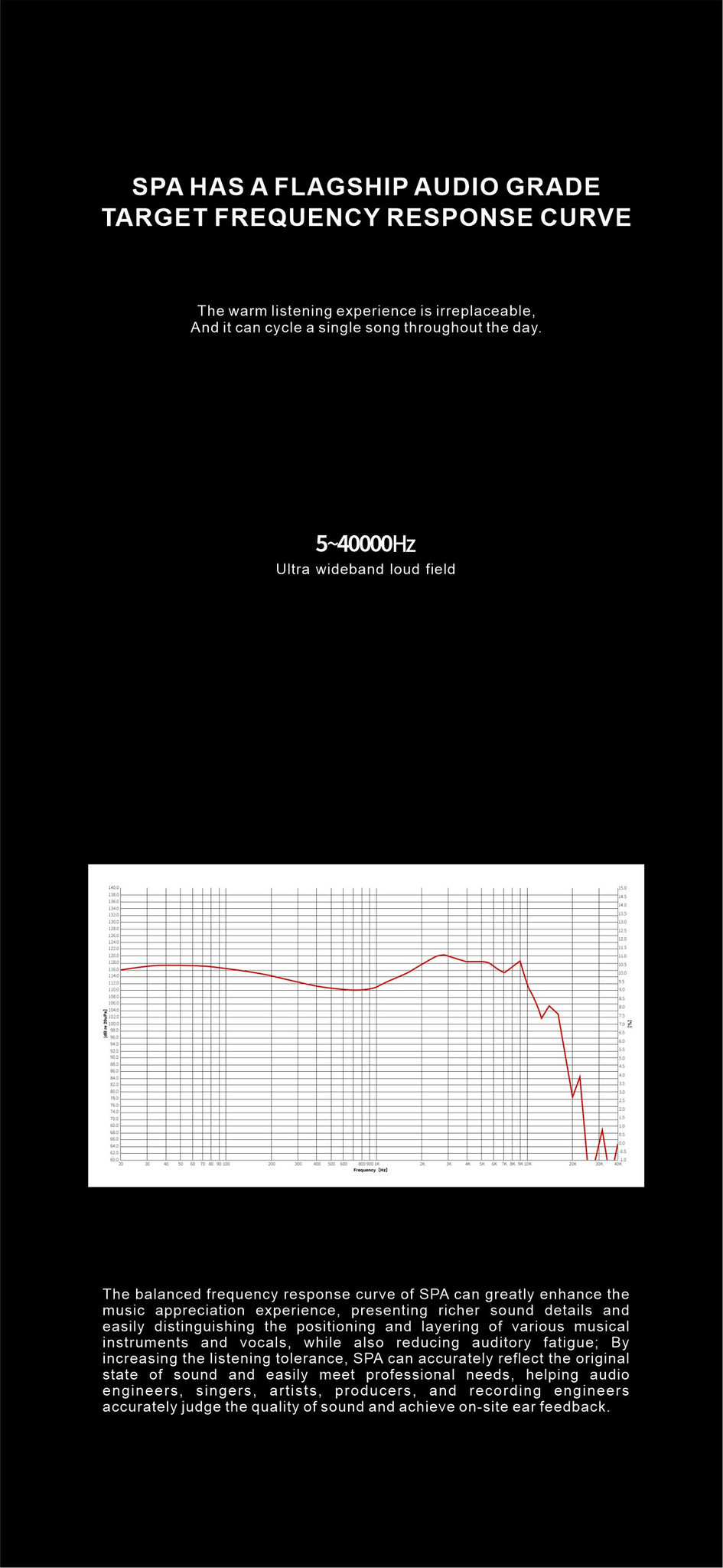 > The balanced frequency response curve of SPA greatly enhances the music appreciation experience by presenting richer sound details. It allows listeners to easily distinguish the positioning and layering of various musical instruments and vocals, while also reducing auditory fatigue. By increasing listening tolerance, SPA accurately reflects the original sound state and easily meets professional needs. It helps audio engineers, singers, artists, producers, and recording engineers to accurately judge sound quality and achieve on-site ear feedback.