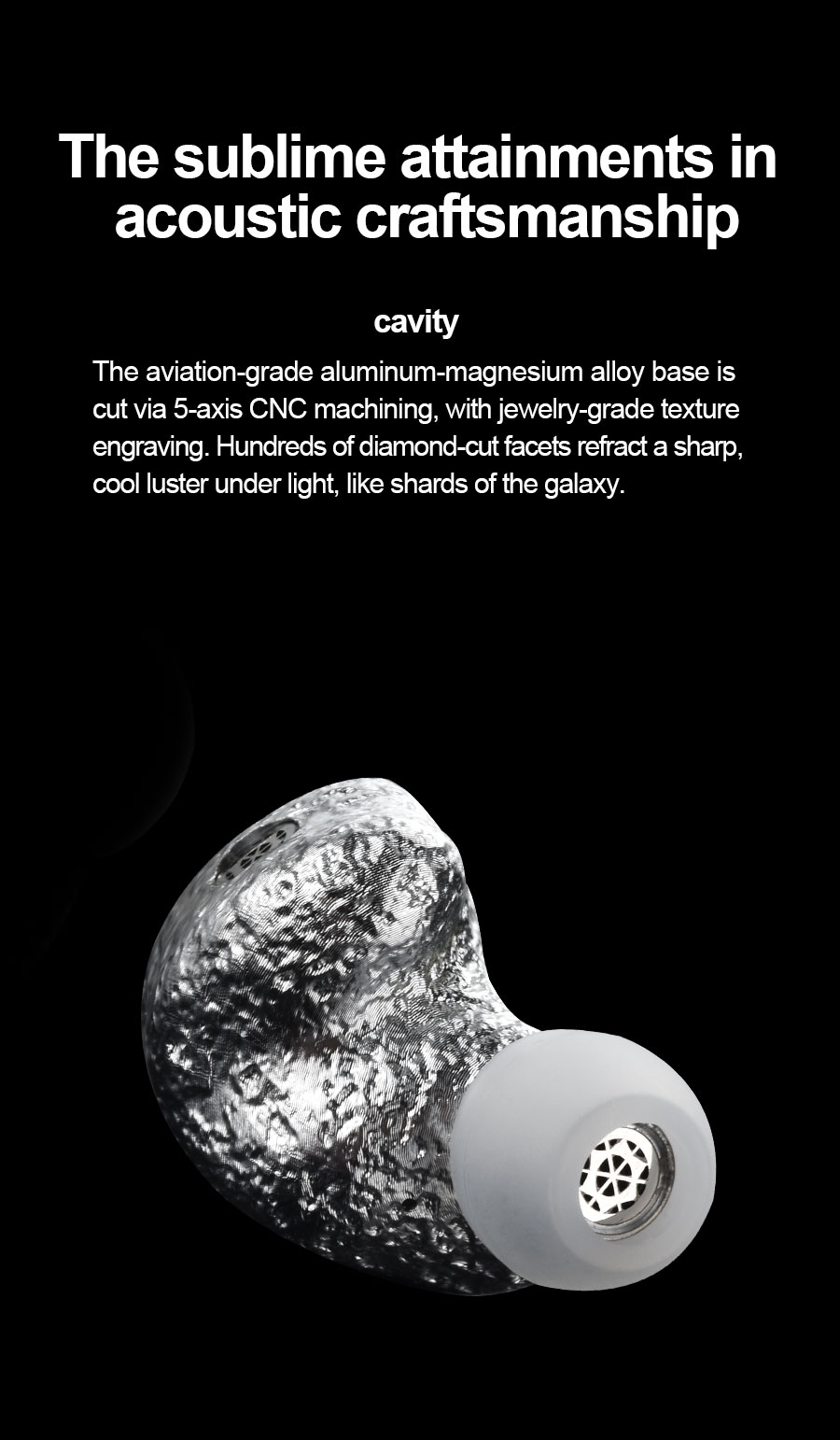 > The aviation-grade aluminum-magnesium alloy base is cut via 5-axis CNC machining, with jewelry-grade texture engraving. Hundreds of diamond-cut facets refract a sharp, cool luster under light, like shards of the galaxy.