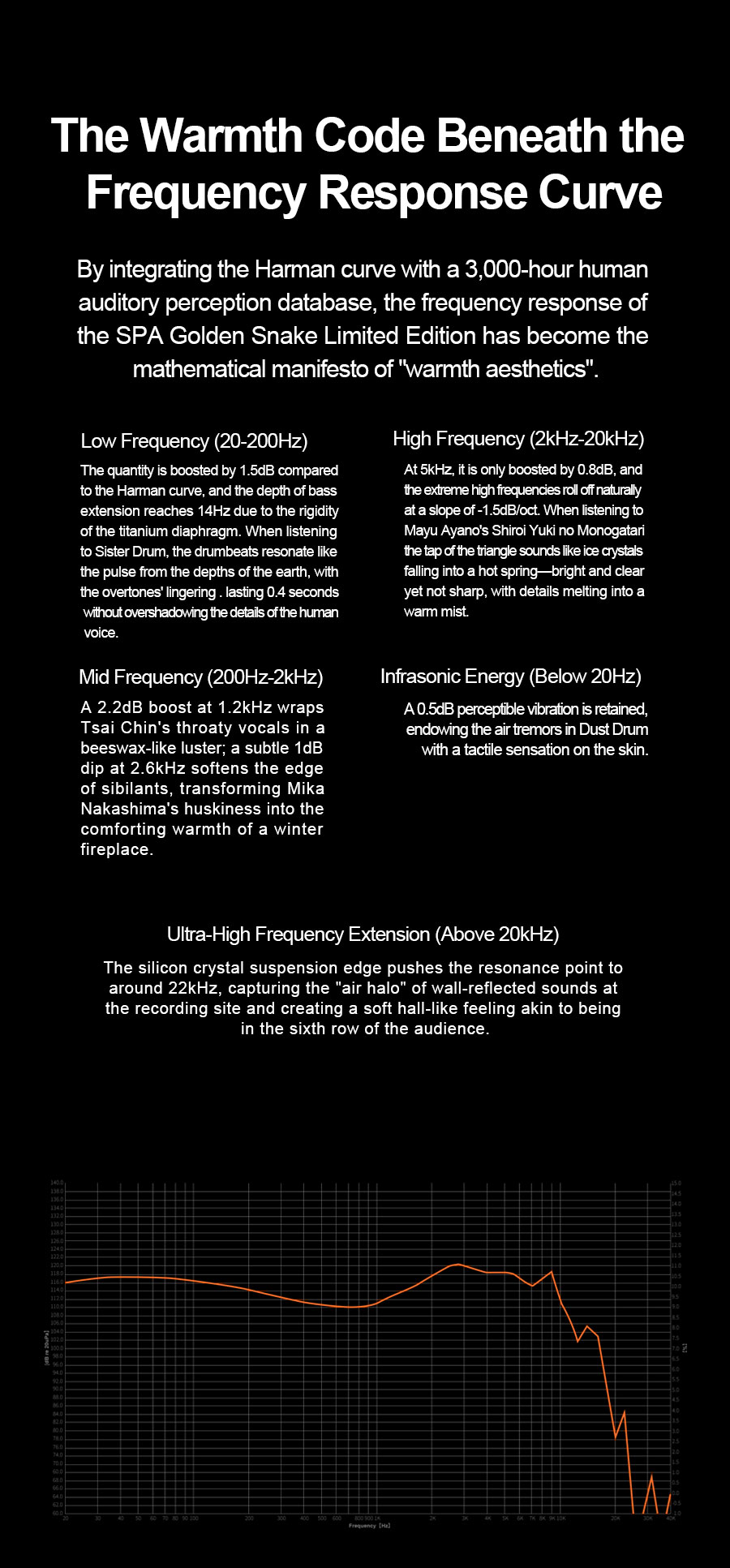 > The quantity is boosted by 1.5dB compared to the Harman curve, and the depth of bass extension reaches 14Hz due to the rigidity of the titanium diaphragm. When listening to Sister Drum, the drumbeats resonate like the pulse from the depths of the earth, with the overtones' lingering. Lasting 0.4 seconds without overshadowing the details of the human voice.