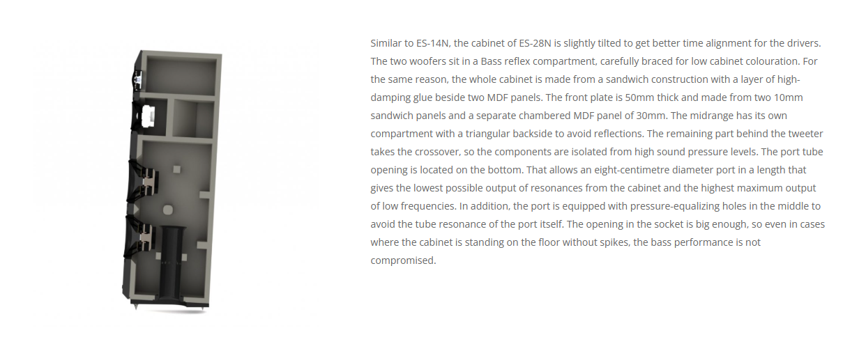 Cabinet: Reflex loaded, damped Sandwich panels, one dimensional braces, Low Noise Port, Duo layer Frontpanel