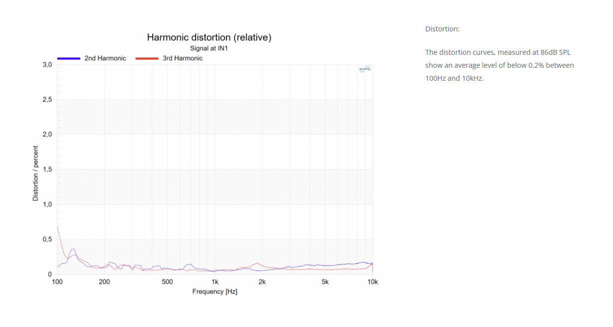 Distortion: average below 0.2% THD @ 86dB between 100Hz and 10,000Hz