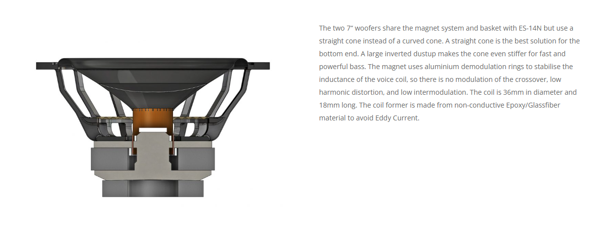 Bass Unit: Two High Power 7”, 36 mm voice coil diameter, Hybrid Ferrite and Neodymium magnet, injection molded straight cone with Mica filling. Low hysteresis rubber surround.