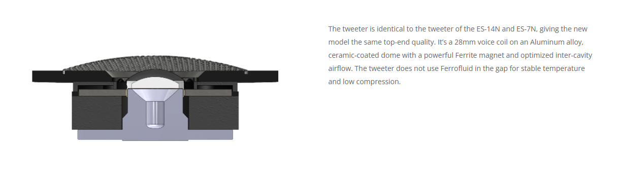 HF Unit: 28 mm tweeter with Aluminum/Ceramic compound dome and no Ferrofluid.