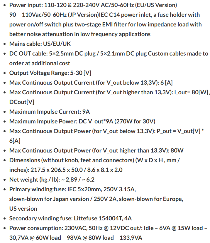Max Continuous Output Power: Vout × 6 A (≤ 13.3 V), 80 W (> 13.3 V)