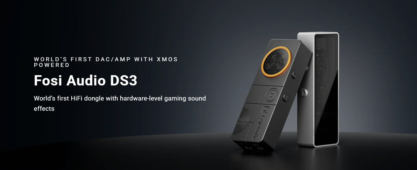 Fosi Audio DS3, DAC, headphone amplifier, 7.1 spatial audio, portable DAC, high-resolution audio, gaming audio, compact audio device, USB-C DAC, XMOS powered DAC.