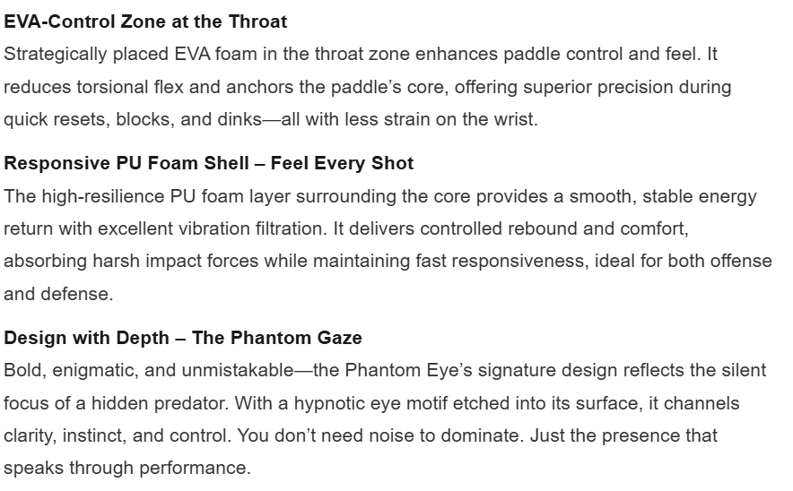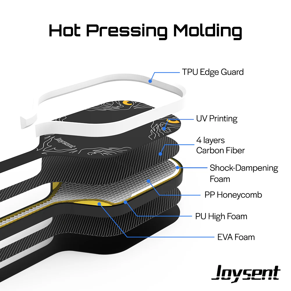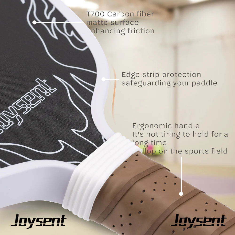Comfort and control are paramount in the design of the Joysent Phantom Eye Paddle. Its ergonomic handle ensures ease of use during extended matches, reducing fatigue and promoting better performance on the court. The T700 carbon fiber matte surface enhances friction, providing superior grip. Every detail has been carefully considered to prioritize player experience, making this paddle an invaluable asset to your game.