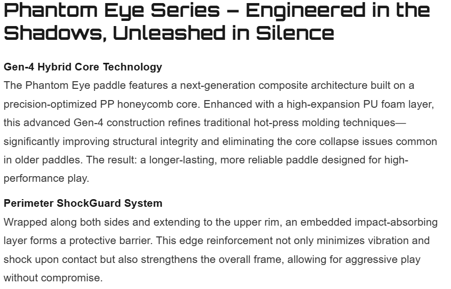The Joysent Phantom Eye Pickleball Paddle is engineered for players seeking performance and reliability. Utilizing advanced Gen-4 Hybrid Core Technology, this paddle features a precision-optimized PP honeycomb core combined with a high-expansion PU foam layer. This innovative construction enhances the paddle's structural integrity, providing a longer life and superior performance for high-level play.