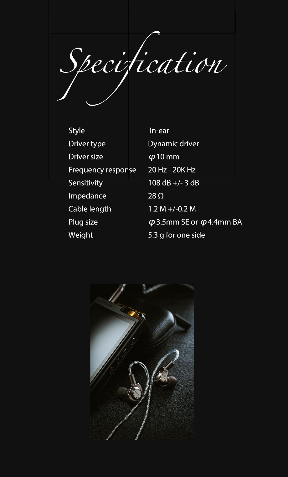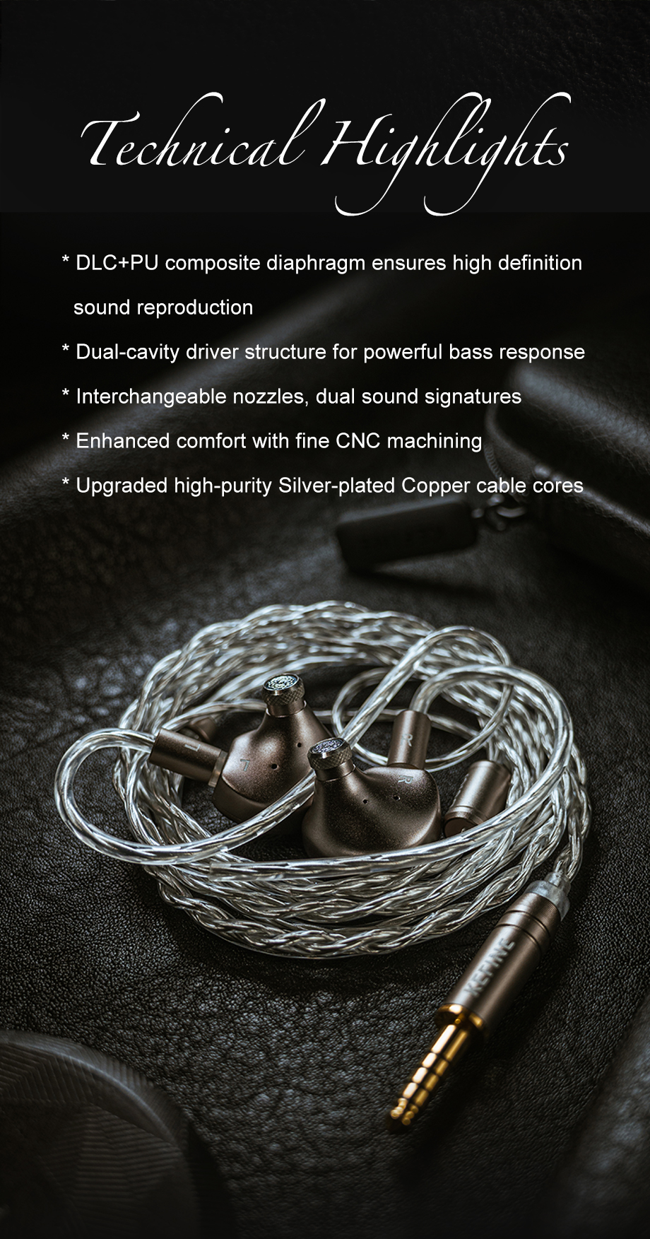 > KEFINE DELCI AE houses a 10mm dual-cavity dynamic driver that promises crystal-clear high-fidelity sound reproduction. The driver adopts a high-quality DLC(Diamond-Like Carbon) material diaphragm with PU suspension. The DLC material here is extremely light in weight and has a solid, robust, rigid durability. It is widely appreciated for its high sound quality, high elasticity, and high mechanical strength. Together with PU suspension and dual-cavity design, the 10mm driver produces a true high-fidelity sound output.