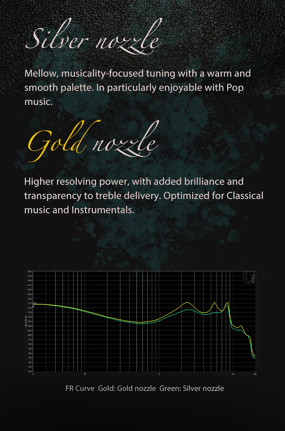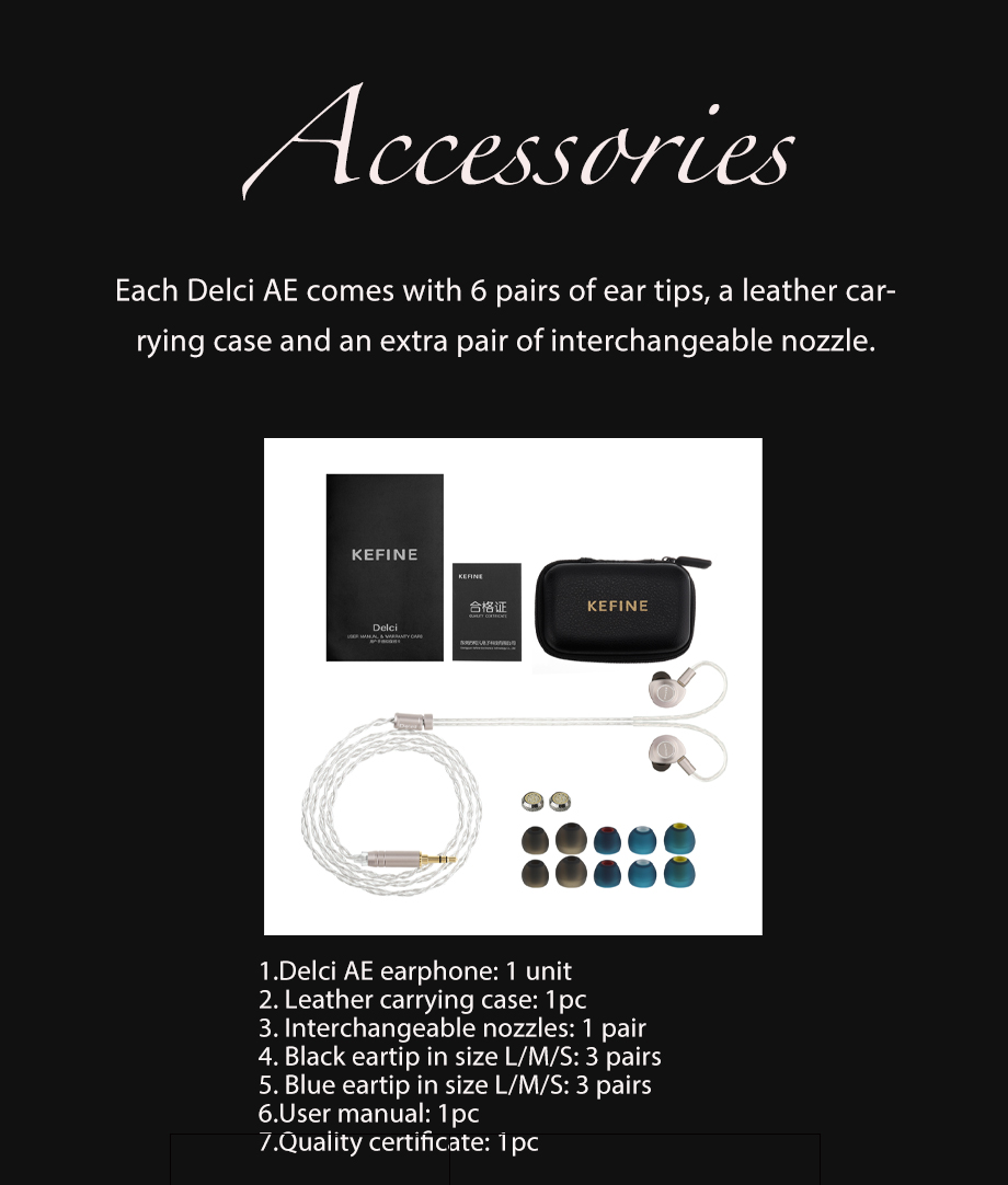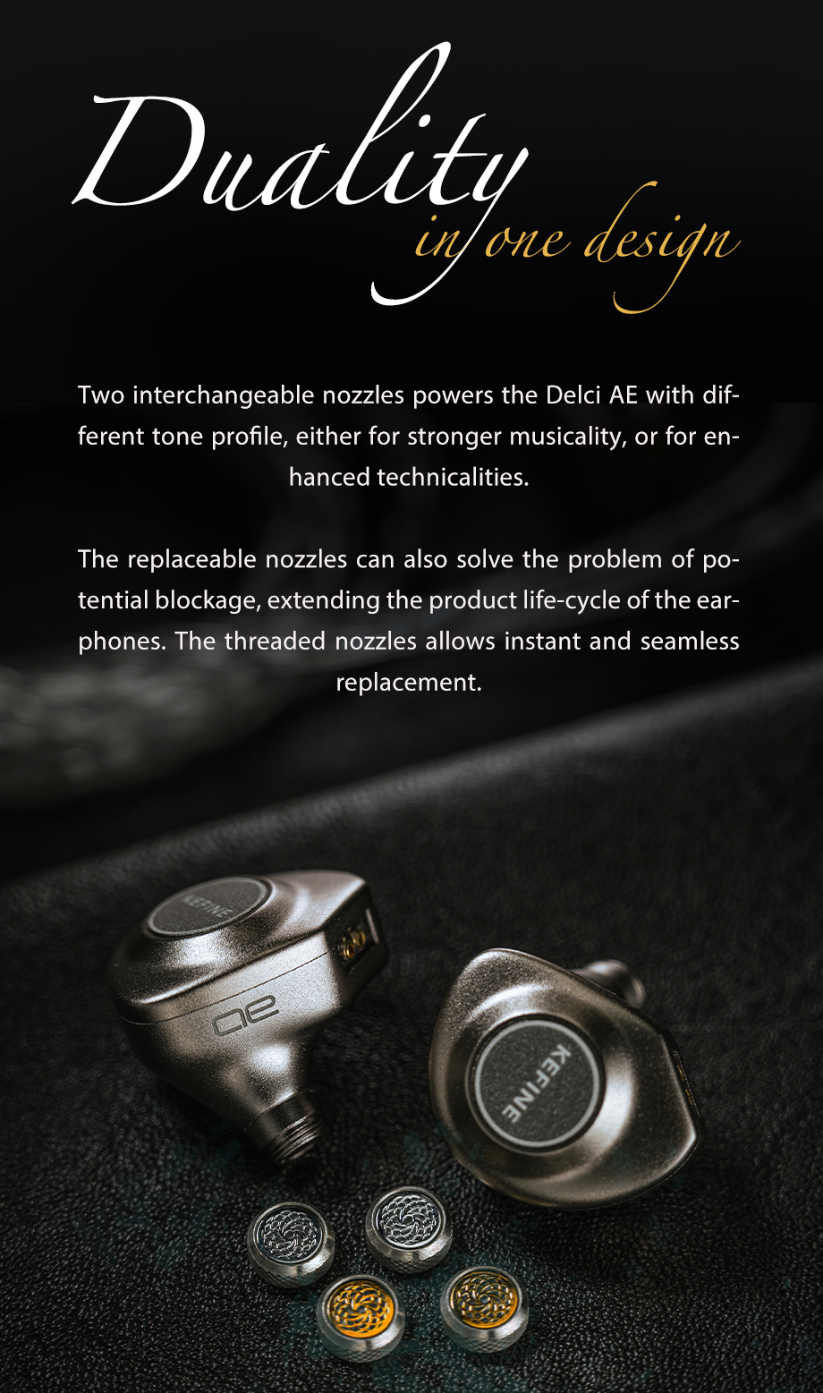 > KEFINE Delci AE comes with two sets of nozzle filters, one with a silver filter and the other with a golden filter. Both the nozzle filters have different densities, and promising dual sound profiles with the set, The silver filter here has a warm, smooth sound suitable for Pop music while the golden filter here provides a bright and transparent sound suitable for classical and instrumental music.
