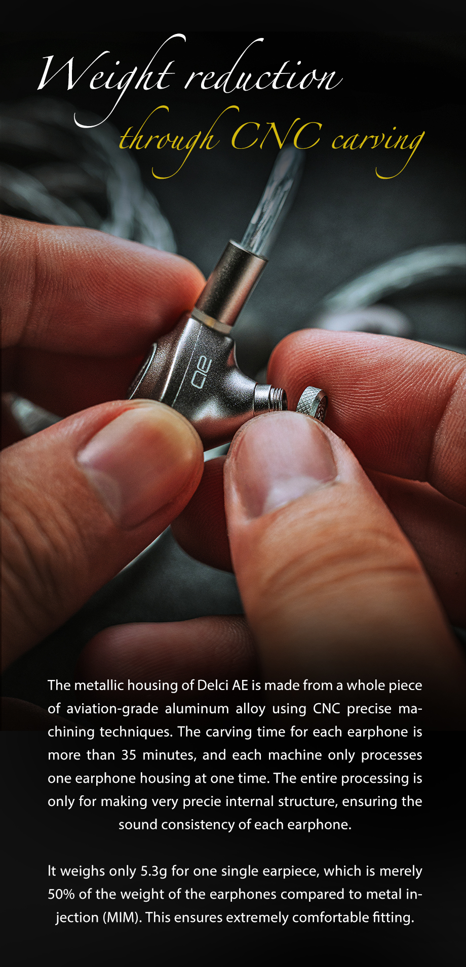 > KEFINE Delci AE features high-quality CNC machined aviation-grade aluminium alloy ear shells. The entire ear shell takes about 35 minutes and each machine only processes one shell cavity at a time. The overall finish and feel of the ear cavities are spectacular and have a premium feel to it. A single earpiece weighs just 5.3 grams, making it one of the lightest metallic cavity in-ear monitors in the market available today.