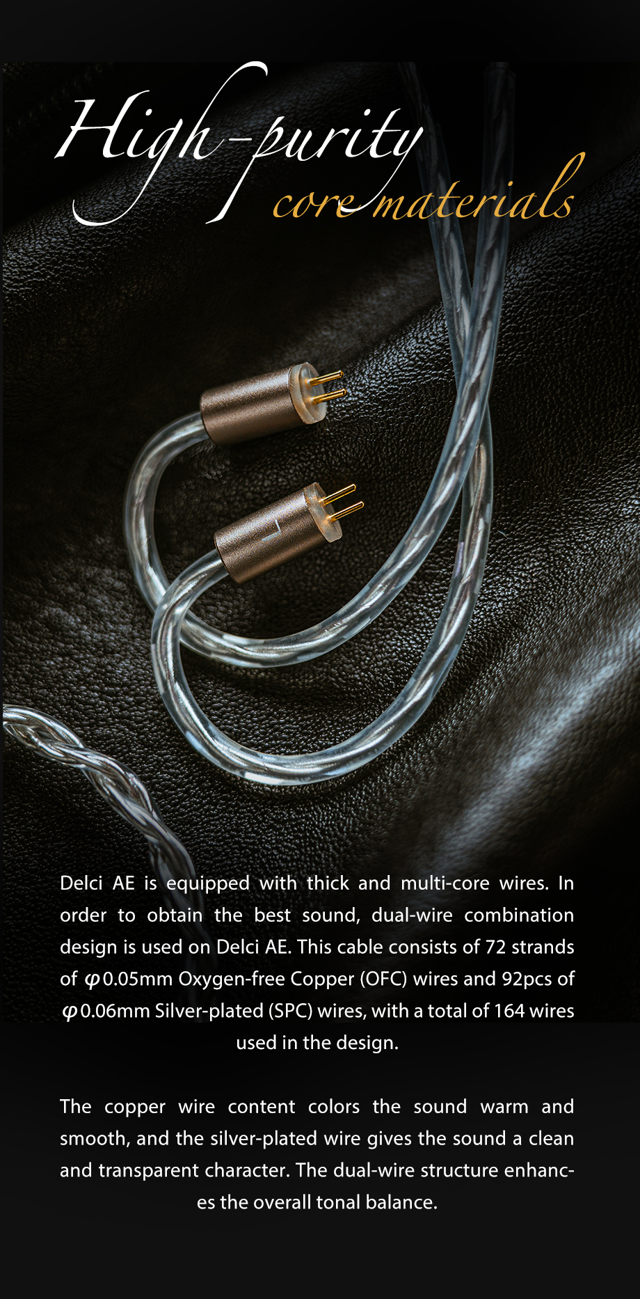 > KEFINE Delci AE comes with a high-purity stock cable. The pair adopts 2-pin 0.78mm universal connectors and comes in 3.5mm or 4.4mm termination options(Choosable at the time of ordering). It is composed of 0.05mm OFC Copper wire cores and 0.06mm Silver-plated wire cores. The total number of wire cores here is 164. This high-purity cable enhances the sound presentation with a clear and transparent response.
