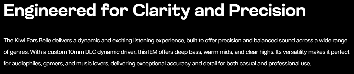 SEO Keywords: Kiwi Ears Belle, In-Ear Monitor, IEM, dynamic driver, audiophile headphones, gaming earphones, noise isolation, deep bass, sound clarity, ergonomic design, music production.
