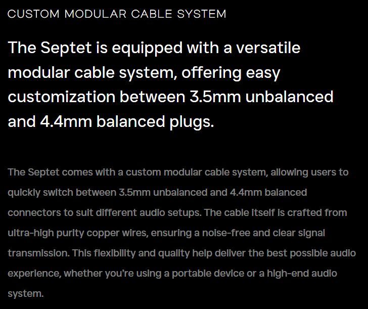 Equipped with a versatile modular cable system, users can quickly switch between 3.5mm unbalanced and 4.4mm balanced connectors, tailoring their audio setup to personal preferences. Whether for music production, gaming, or high-fidelity playback, the Septet offers customizable flexibility without sacrificing sound integrity.