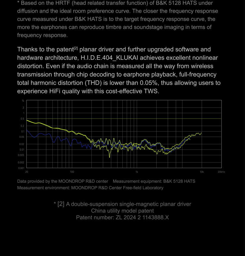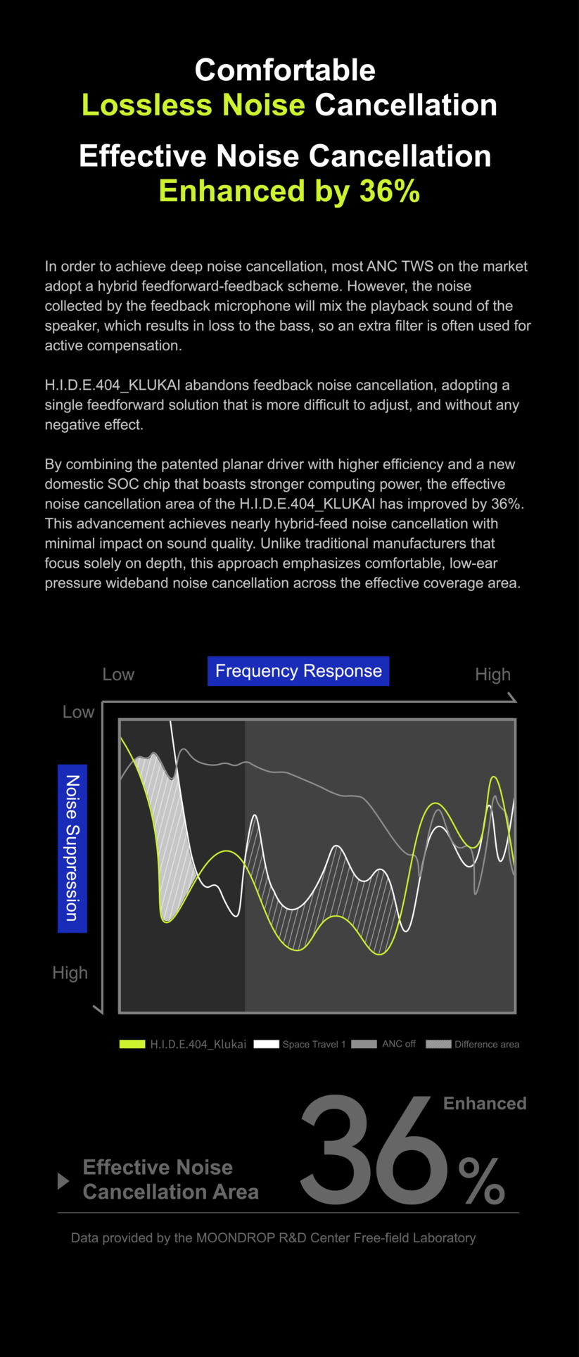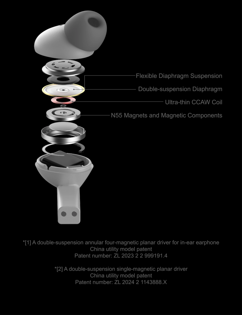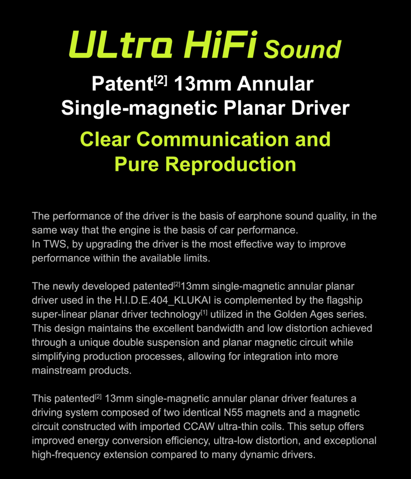 The H.I.D.E.404_Klukai earphones represent a pinnacle in true wireless audio technology, delivering an exceptional listening experience through their innovative design. The earbuds feature a patented 13mm annular single-magnetic planar driver that significantly enhances sound reproduction while minimizing distortion. This driver operates via advanced technology developed through collaboration with MOONDROP's R&D team, ensuring precise tuning for balanced audio that meets high-fidelity standards.