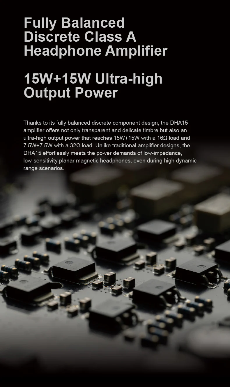The DHA 15 is a cutting-edge all-in-one DAC and amplifier engineered for audiophiles and casual listeners alike. This unit boasts powerful performance capabilities with an output power of 15W+15W, making it suitable for a variety of headphones, including planar magnetic models. Its high efficiency and low noise design ensure a dynamic and transparent sound stage, delivering the clarity you crave in every note.