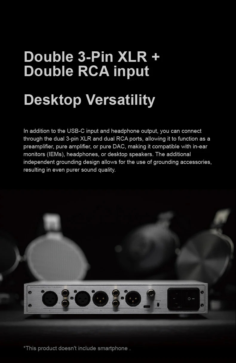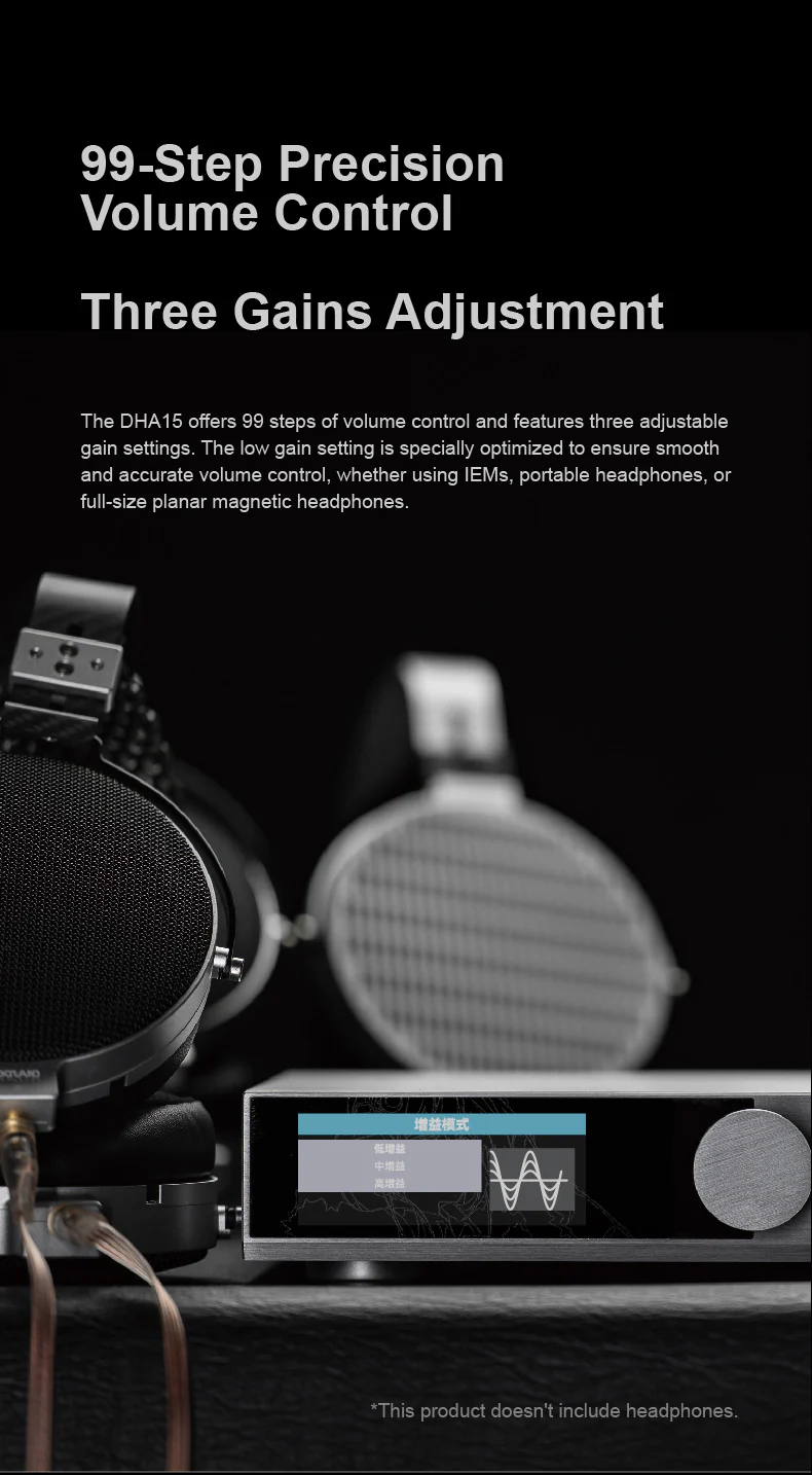 Designed with multiple connectivity options, the DHA 15 facilitates seamless integration into your audio setup. Available inputs include USB-C, dual 3-pin XLR, and dual RCA ports, allowing you to configure the device as a preamplifier, pure amplifier, or dedicated DAC. The independent grounding design enhances sound purity, eliminating unwanted noise and improving overall audio fidelity. The product also features a practical volume control system with 99 steps, allowing for precise sound adjustments tailored to your preferred listening level.