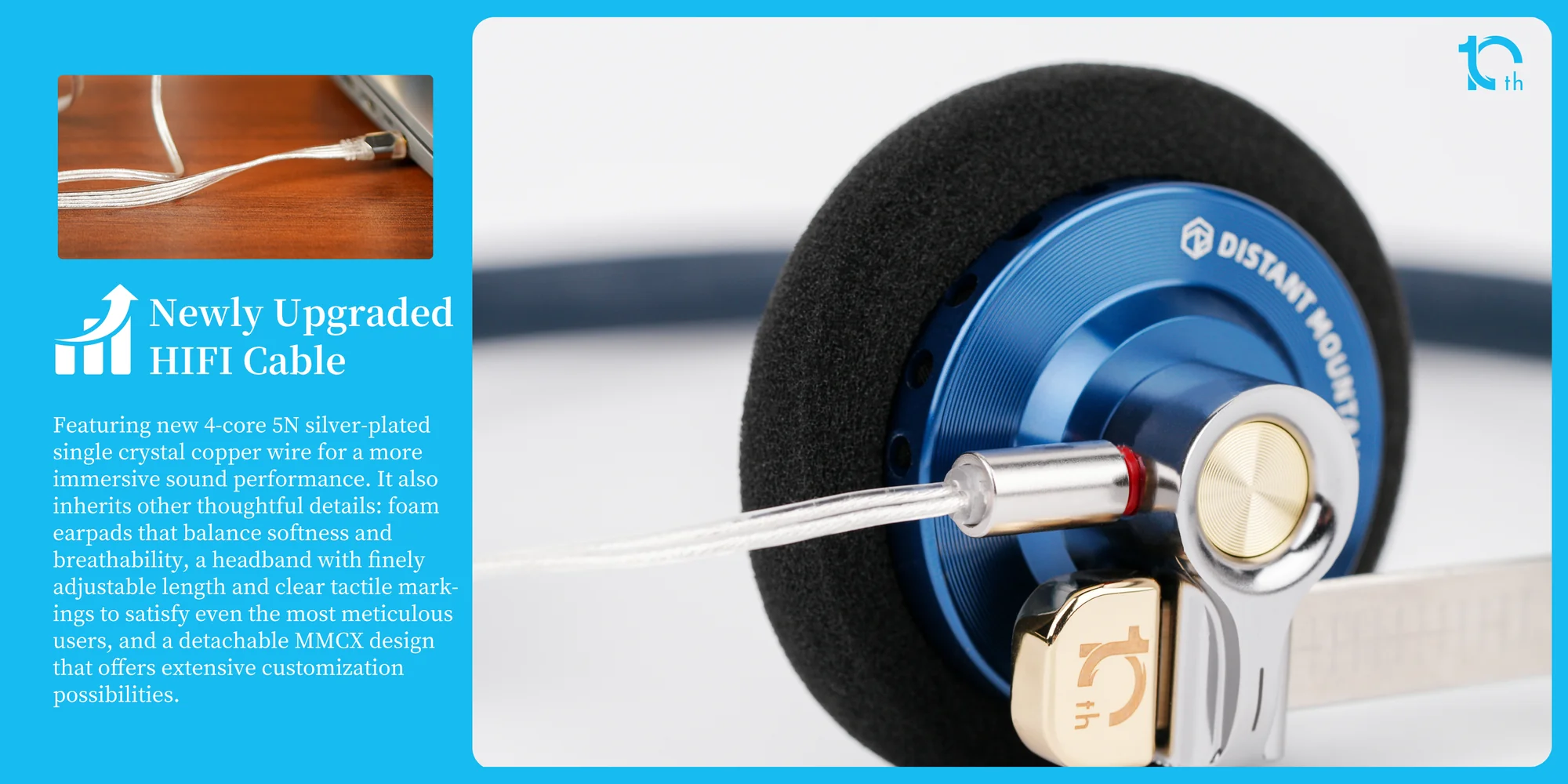 > Featuring new 4-core 5N silver-plated single crystal copper wire for a more immersive sound performance. It also inherits other thoughtful details: foam earpads that balance softness and breathability, a headband with finely adjustable length and clear tactile markings to satisfy even the most meticulous users, and a detachable MMCX design that offers extensive customization possibilities.