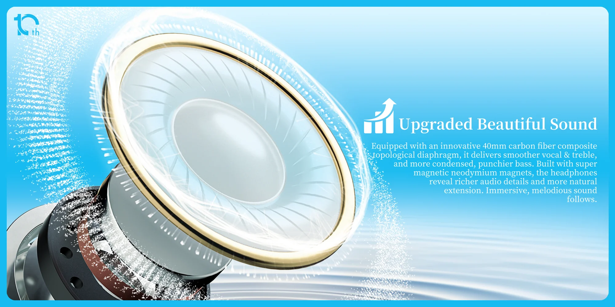 > Equipped with an innovative 40mm carbon fiber composite topological diaphragm, it delivers smoother vocal & treble, and more condensed, punchier bass. Built with super magnetic neodymium magnets, the headphones reveal richer audio details and more natural extension. Immersive, melodious sound follows.