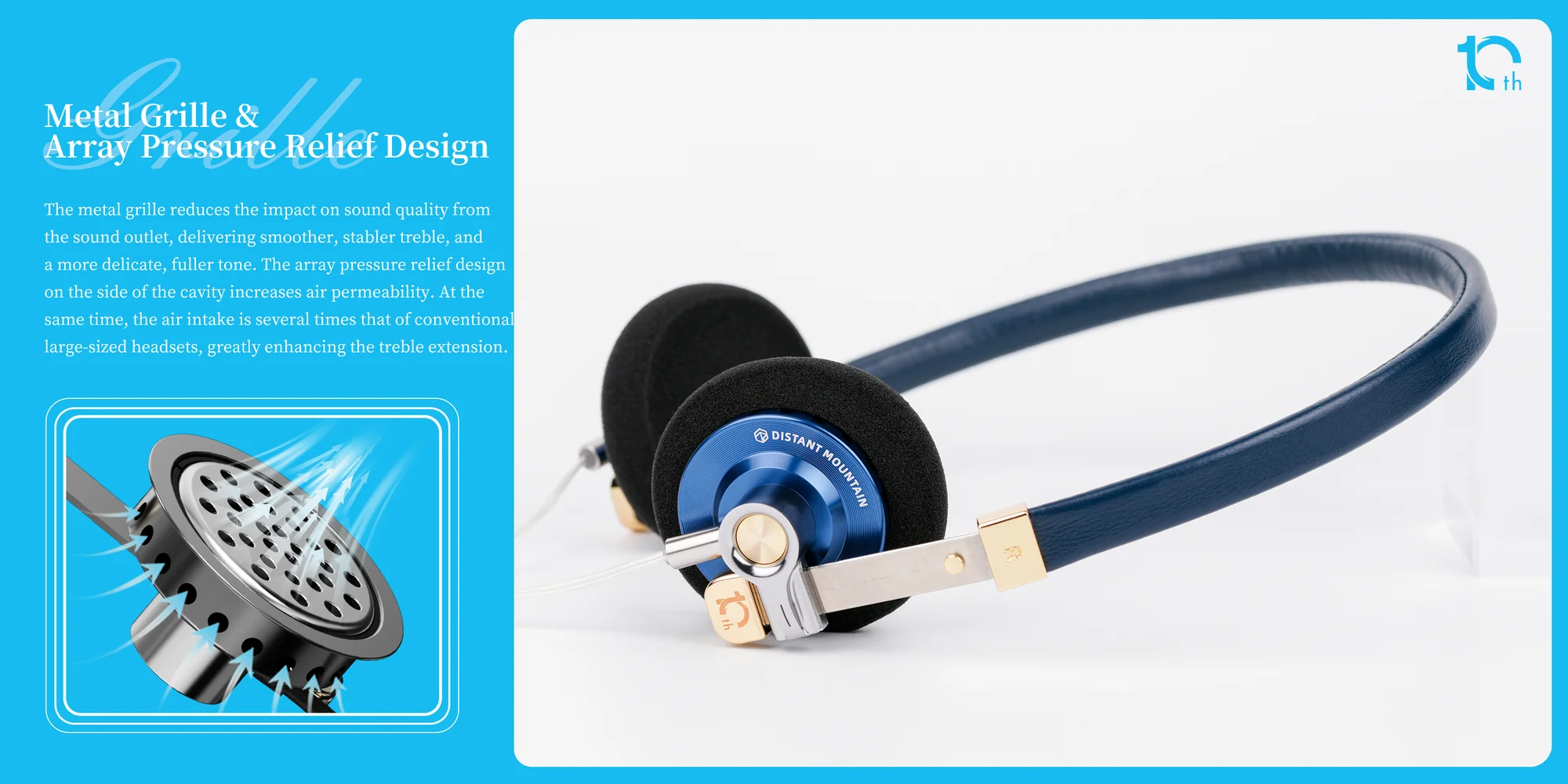 > The metal grille reduces the impact on sound quality from the sound outlet, delivering smoother, stabler treble, and a more delicate, fuller tone. The array pressure relief design on the side of the cavity increases air permeability. At the same time, the air intake is several times that of conventional large-sized headsets, greatly enhancing the treble extension.