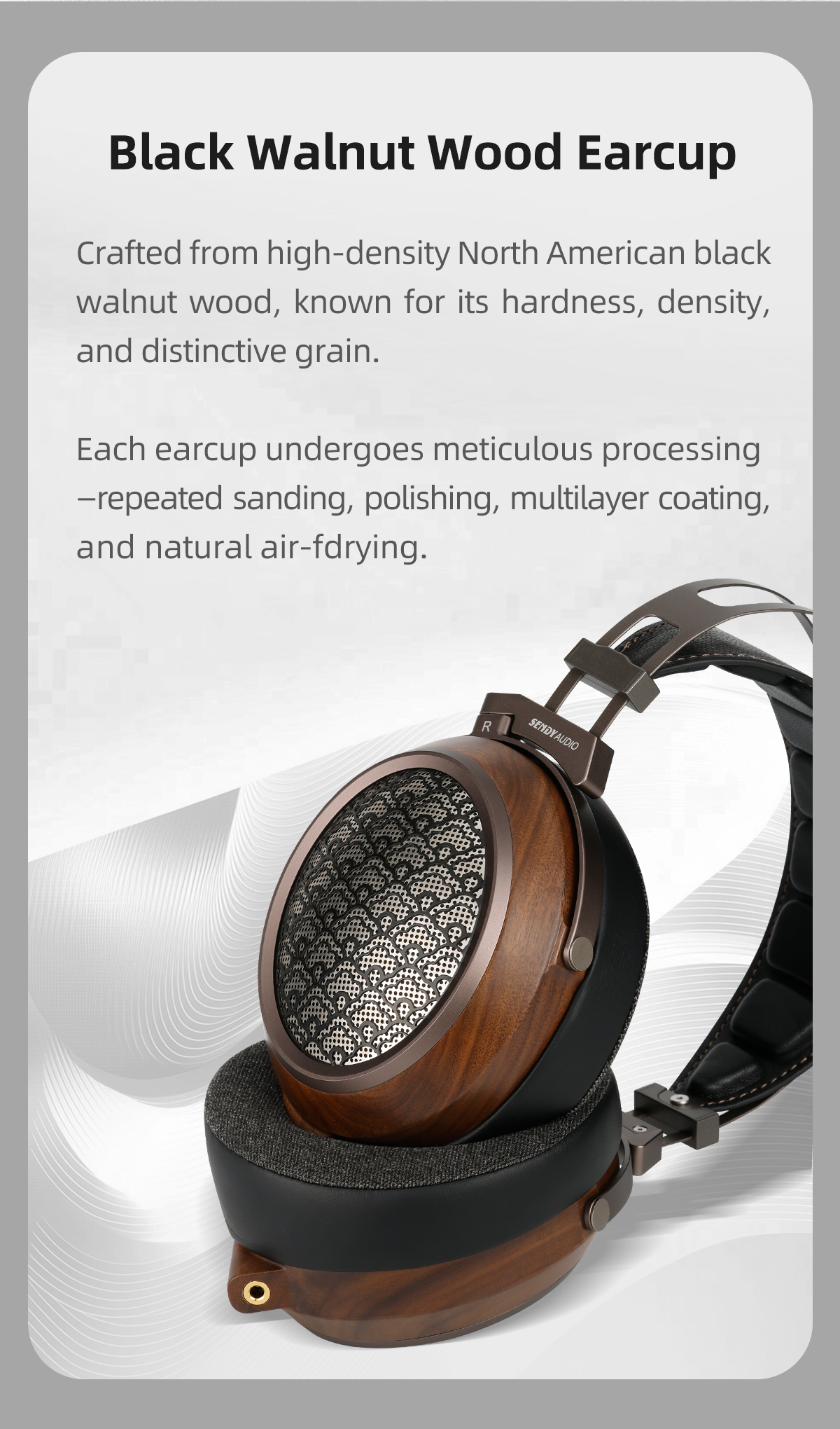 Egret headphones, planar magnetic headphones, high-fidelity audio, open back headphones, Sendy Audio, black walnut wood headphones, ergonomic design, adjustable headband, audiophile headphones.