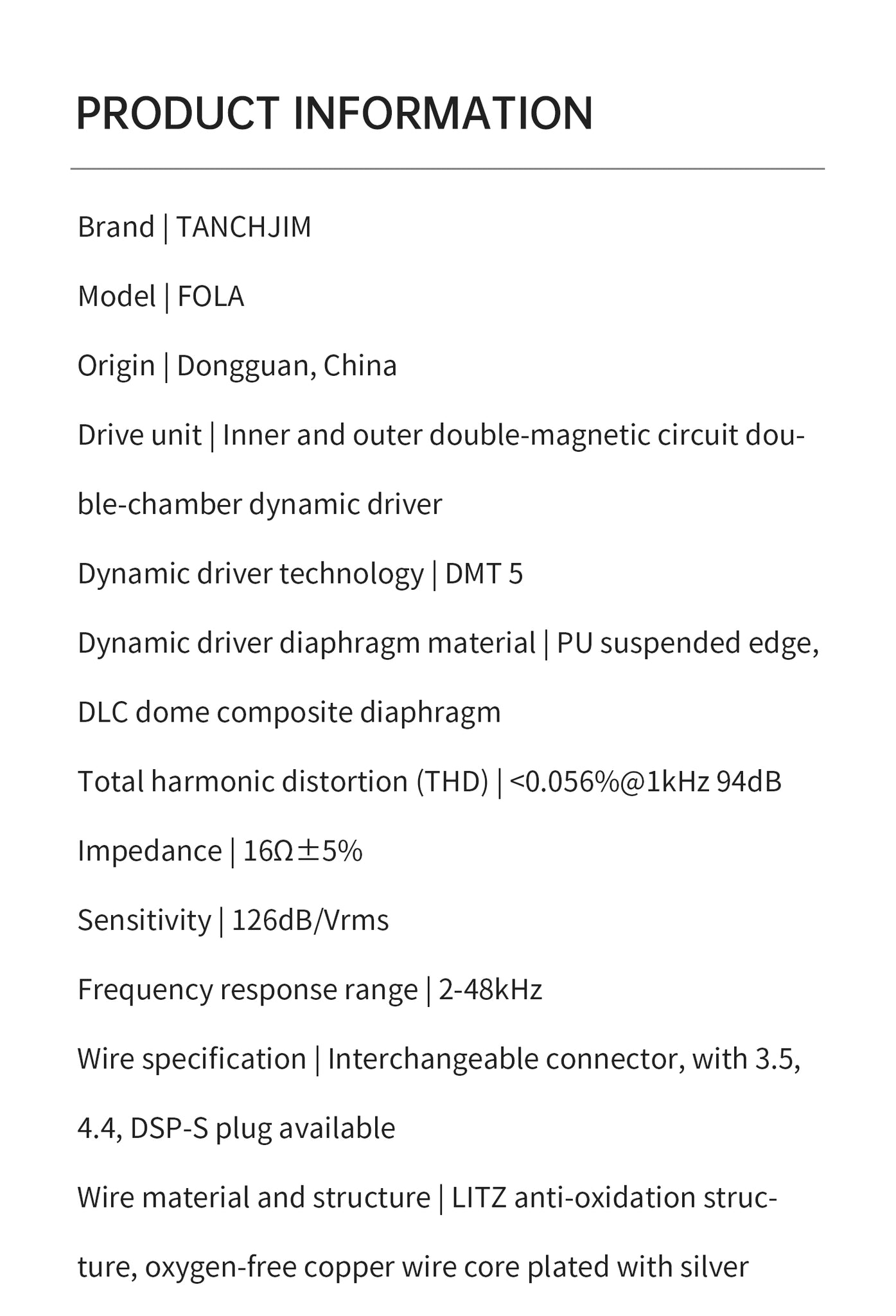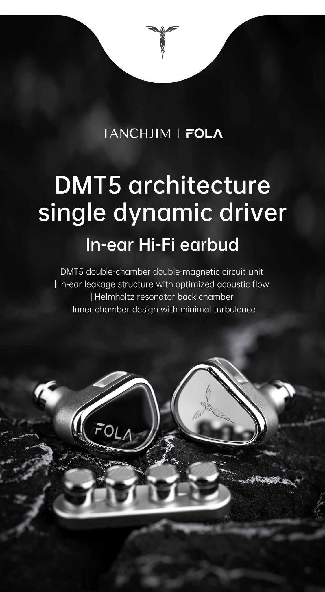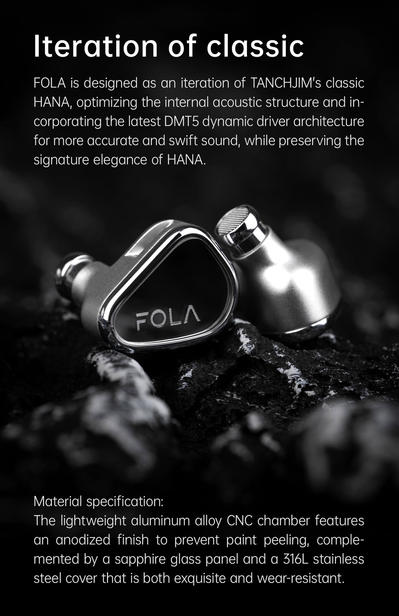 > FOLA is designed as an iteration of TANCHJIM's classic HANA, optimizing the internal acoustic structure and incorporating the latest DMT5 dynamic driver architecture for more accurate and swift sound, while preserving the signature elegance of HANA.