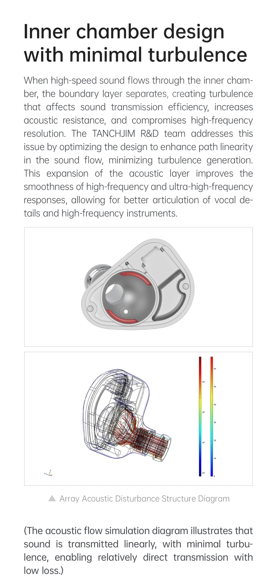 > When high-speed sound flows through the inner chamber, the boundary layer separates, creating turbulence that affects sound transmission efficiency, increases acoustic resistance, and compromises high-frequency resolution. The TANCHJIM R&D team addresses this issue by optimizing the design to enhance path linearity in the sound flow, minimizing turbulence generation. This expansion of the acoustic layer improves the smoothness of high-frequency and ultra-high-frequency responses, allowing for better articulation of vocal details and high-frequency instruments.