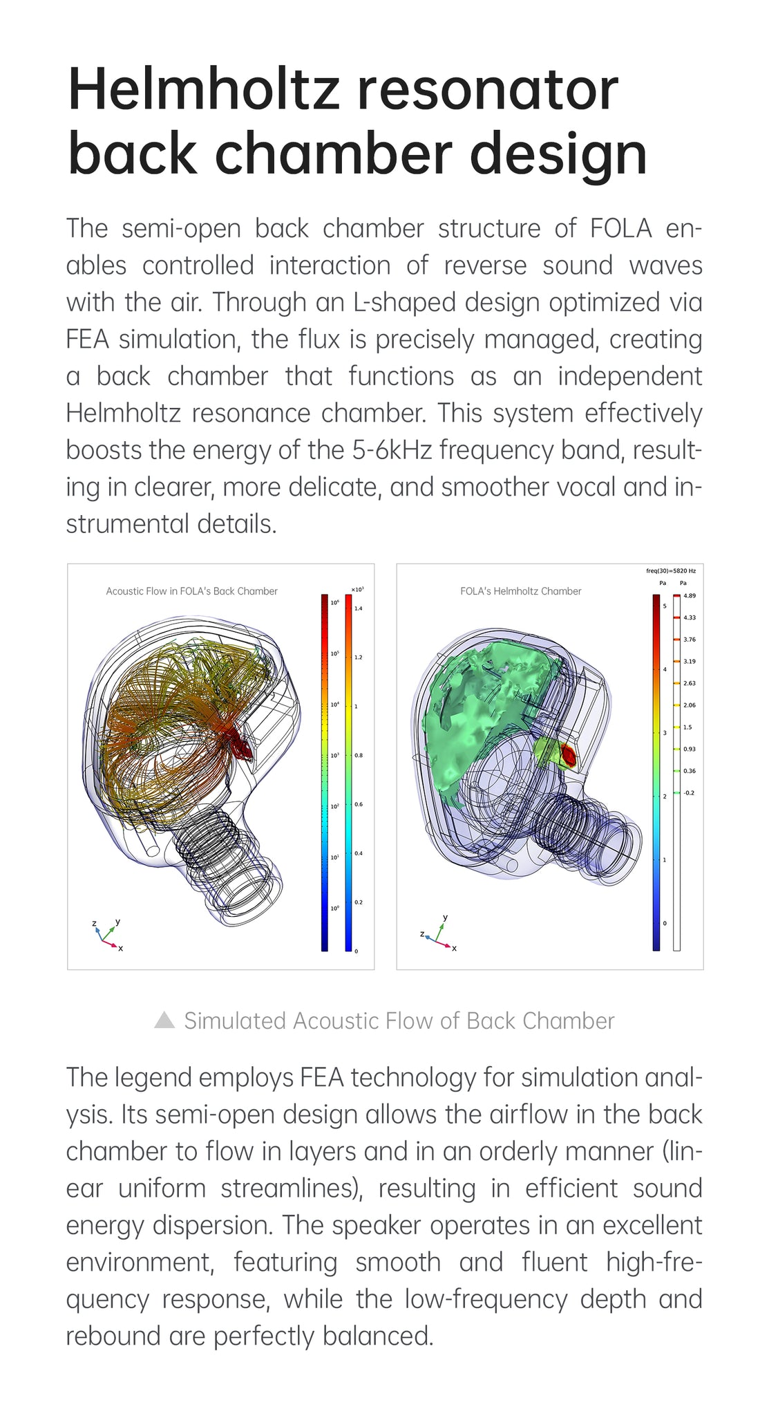 > The semi-open back chamber structure of FOLA enables controlled interaction of reverse sound waves with the air. Through an L-shaped design optimized via FEA simulation, the flux is precisely managed, creating a back chamber that functions as an independent Helmholtz resonance chamber. This system effectively boosts the energy of the 5-6kHz frequency band, resulting in clearer, more delicate, and smoother vocal and instrumental details.