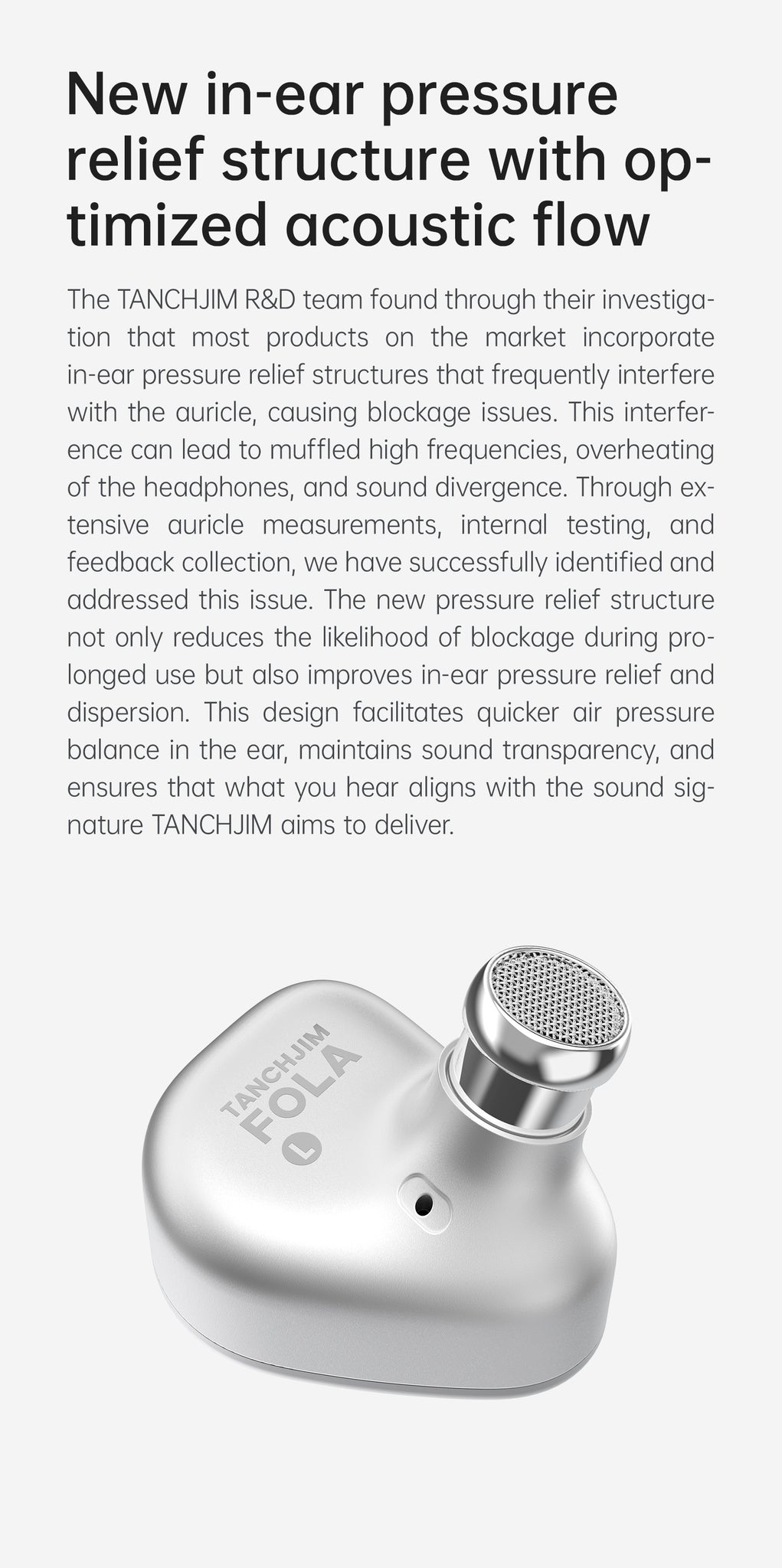 > The TANCHJIM R&D team found through their investigation that most products on the market incorporate in-ear pressure relief structures that frequently interfere with the auricle, causing blockage issues. This interference can lead to muffled high frequencies, overheating of the headphones, and sound divergence. Through extensive auricle measurements, internal testing, and feedback collection, we have successfully identified and addressed this issue. The new pressure relief structure not only reduces the likelihood of blockage during prolonged use but also improves in-ear pressure relief and dispersion. This design facilitates quicker air pressure balance in the ear, maintains sound transparency, and ensures that what you hear aligns with the sound signature TANCHJIM aims to deliver.
