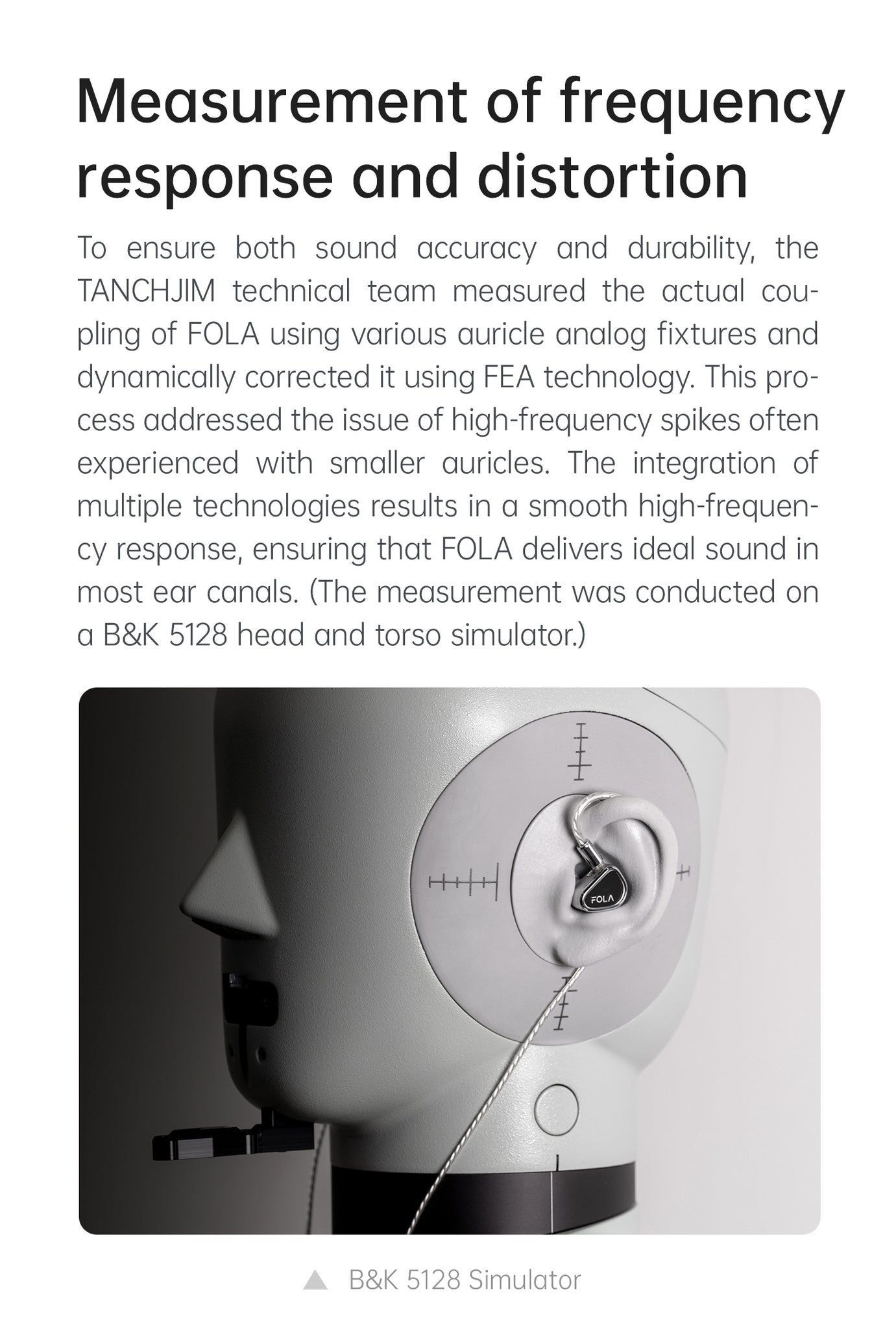 > To ensure both sound accuracy and durability, the TANCHJIM technical team measured the actual coupling of FOLA using various auricle analog fixtures and dynamically corrected it using FEA technology. This process addressed the issue of high-frequency spikes often experienced with smaller auricles. The integration of multiple technologies results in a smooth high-frequency response, ensuring that FOLA delivers ideal sound in most ear canals. (The measurement was conducted on a B&K 5128 head and torso simulator.)