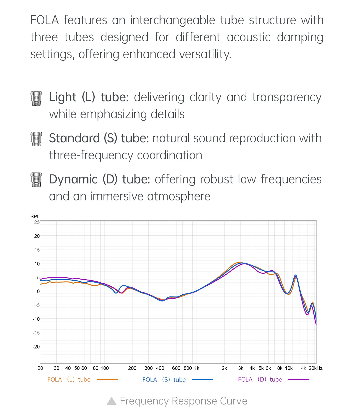 > FOLA features an interchangeable tube structure with three tubes designed for different acoustic damping settings, offering enhanced versatility.