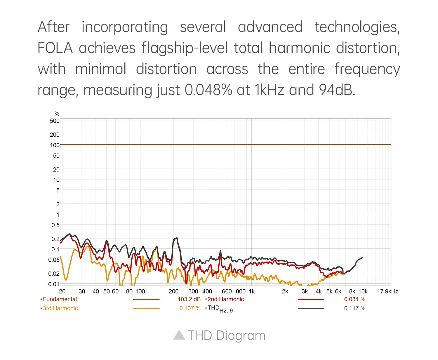 > After incorporating several advanced technologies, FOLA achieves flagship-level total harmonic distortion, with minimal distortion across the entire frequency range, measuring just 0.048% at 1kHz and 94dB.