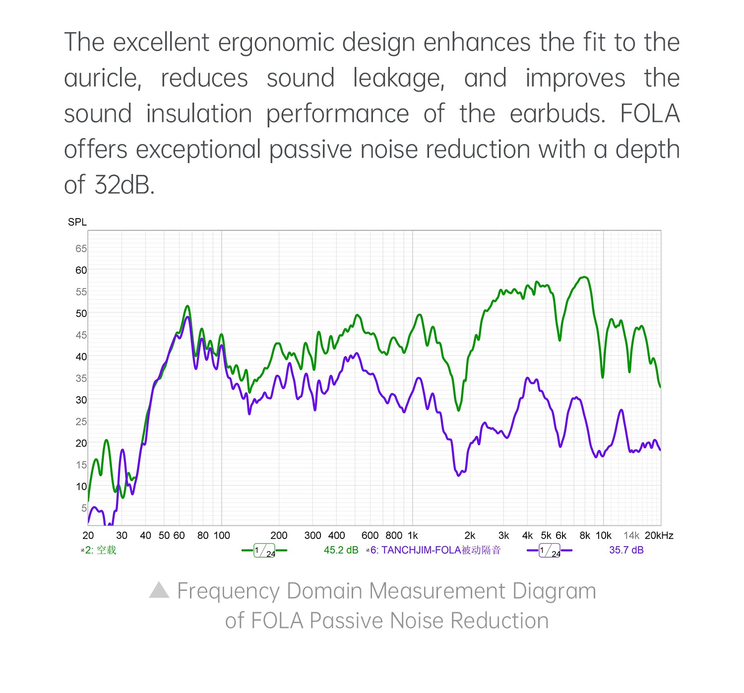 > The excellent ergonomic design enhances the fit to the auricle, reduces sound leakage, and improves the sound insulation performance of the earbuds. FOLA offers exceptional passive noise reduction with a depth of 32dB.