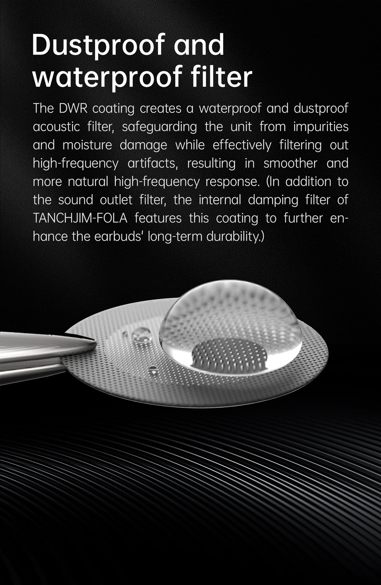 > The DWR coating creates a waterproof and dustproof acoustic filter, safeguarding the unit from impurities and moisture damage while effectively filtering out high-frequency artifacts, resulting in smoother and more natural high-frequency response. (In addition to the sound outlet filter, the internal damping filter of TANCHJIM-FOLA features this coating to further enhance the earbuds' long-term durability.)