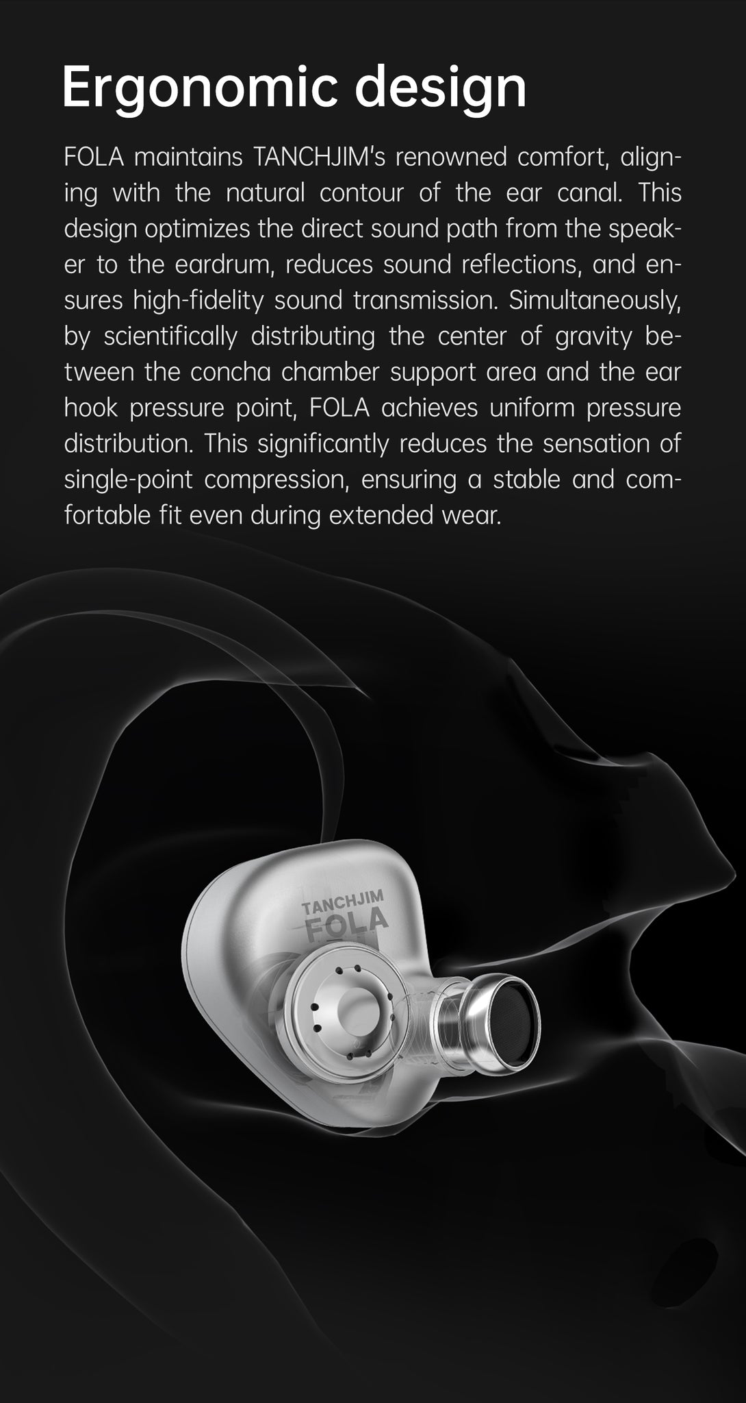 > FOLA maintains TANCHJIM's renowned comfort, aligning with the natural contour of the ear canal. This design optimizes the direct sound path from the speaker to the eardrum, reduces sound reflections, and ensures high-fidelity sound transmission. Simultaneously, by scientifically distributing the center of gravity between the concha chamber support area and the ear hook pressure point, FOLA achieves uniform pressure distribution. This significantly reduces the sensation of single-point compression, ensuring a stable and comfortable fit even during extended wear.