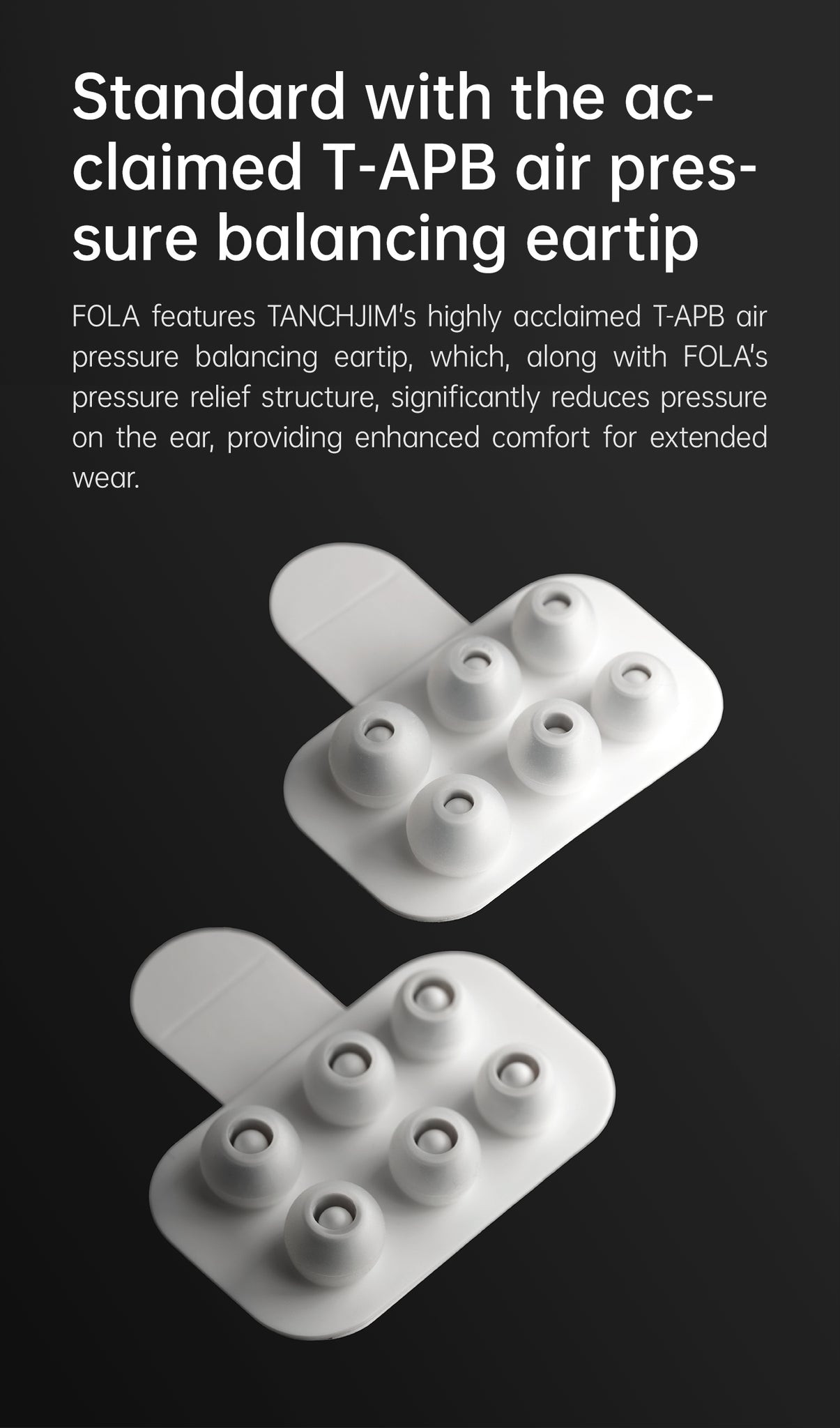 > FOLA features TANCHJIM's highly acclaimed T-APB air pressure balancing eartip, which, along with FOLA's pressure relief structure, significantly reduces pressure on the ear, providing enhanced comfort for extended wear.