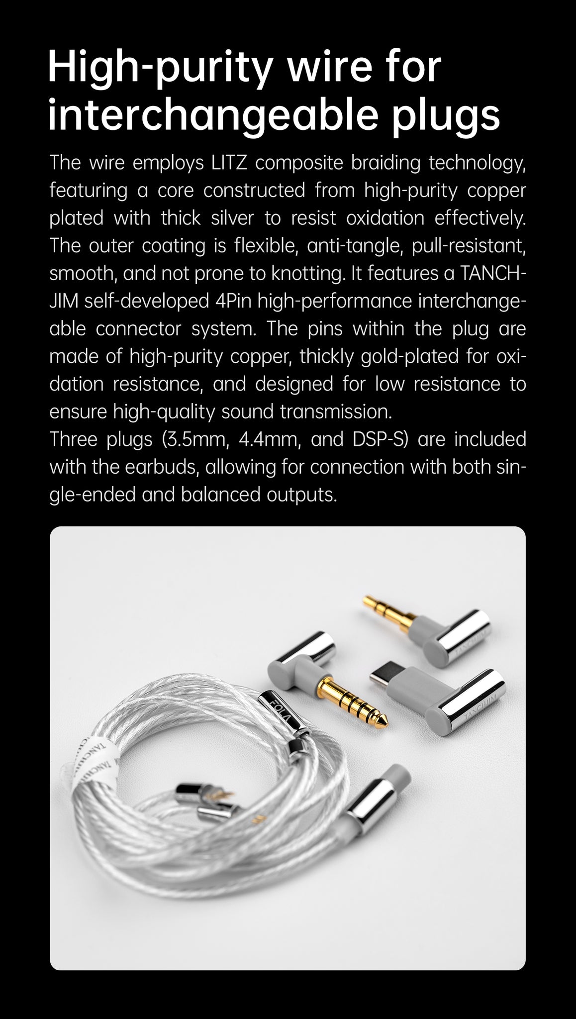 > The wire employs LITZ composite braiding technology, featuring a core constructed from high-purity copper plated with thick silver to resist oxidation effectively. The outer coating is flexible, anti-tangle, pull-resistant, smooth, and not prone to knotting. It features a TANCHJIM self-developed 4Pin high-performance interchangeable connector system. The pins within the plug are made of high-purity copper, thickly gold-plated for oxidation resistance, and designed for low resistance to ensure high-quality sound transmission.