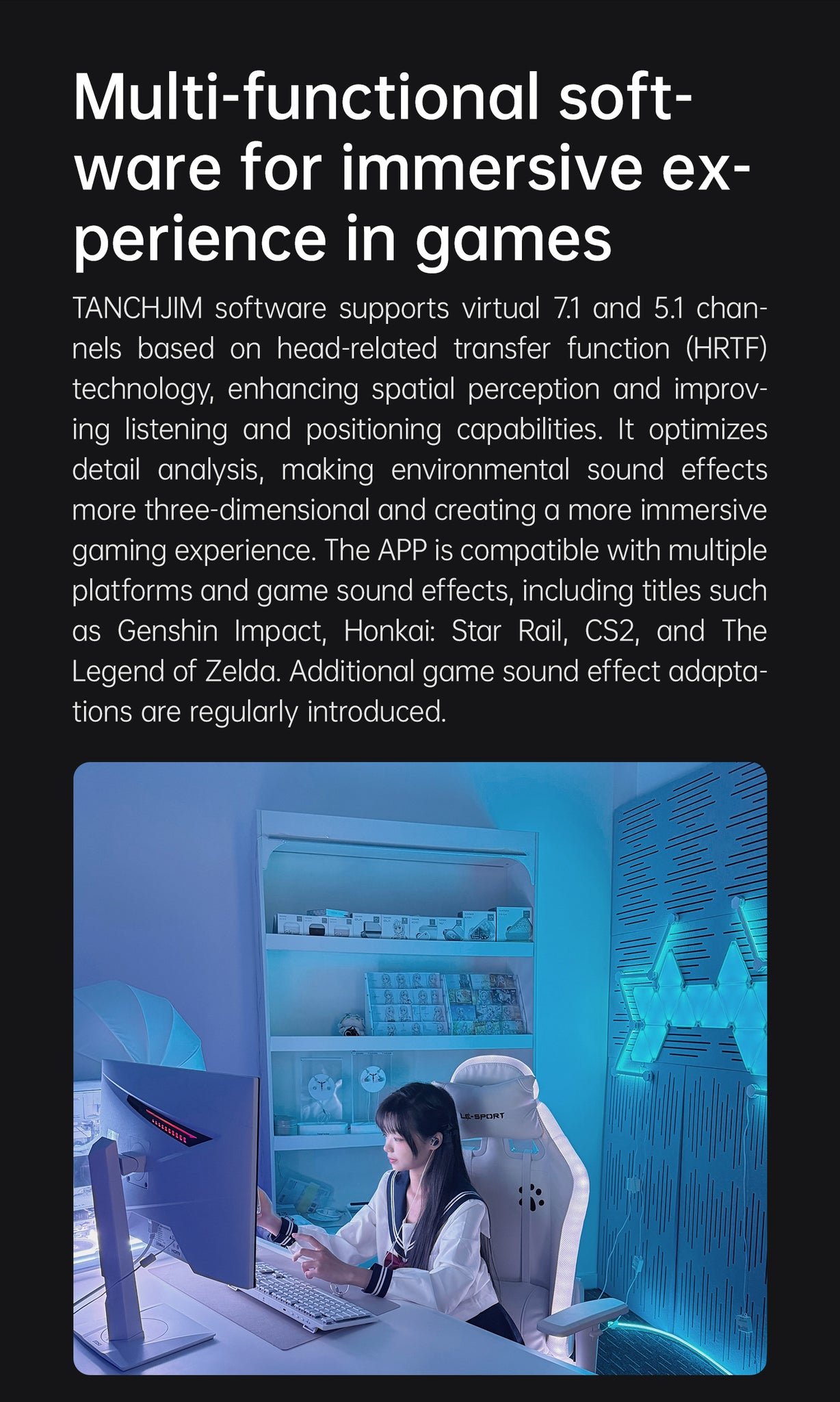 > TANCHJIM software supports virtual 7.1 and 5.1 channels based on head-related transfer function (HRTF) technology, enhancing spatial perception and improving listening and positioning capabilities. It optimizes detail analysis, making environmental sound effects more three-dimensional and creating a more immersive gaming experience. The APP is compatible with multiple platforms and game sound effects, including titles such as Genshin Impact, Honkai: Star Rail, CS2, and The Legend of Zelda. Additional game sound effect adaptations are regularly introduced.