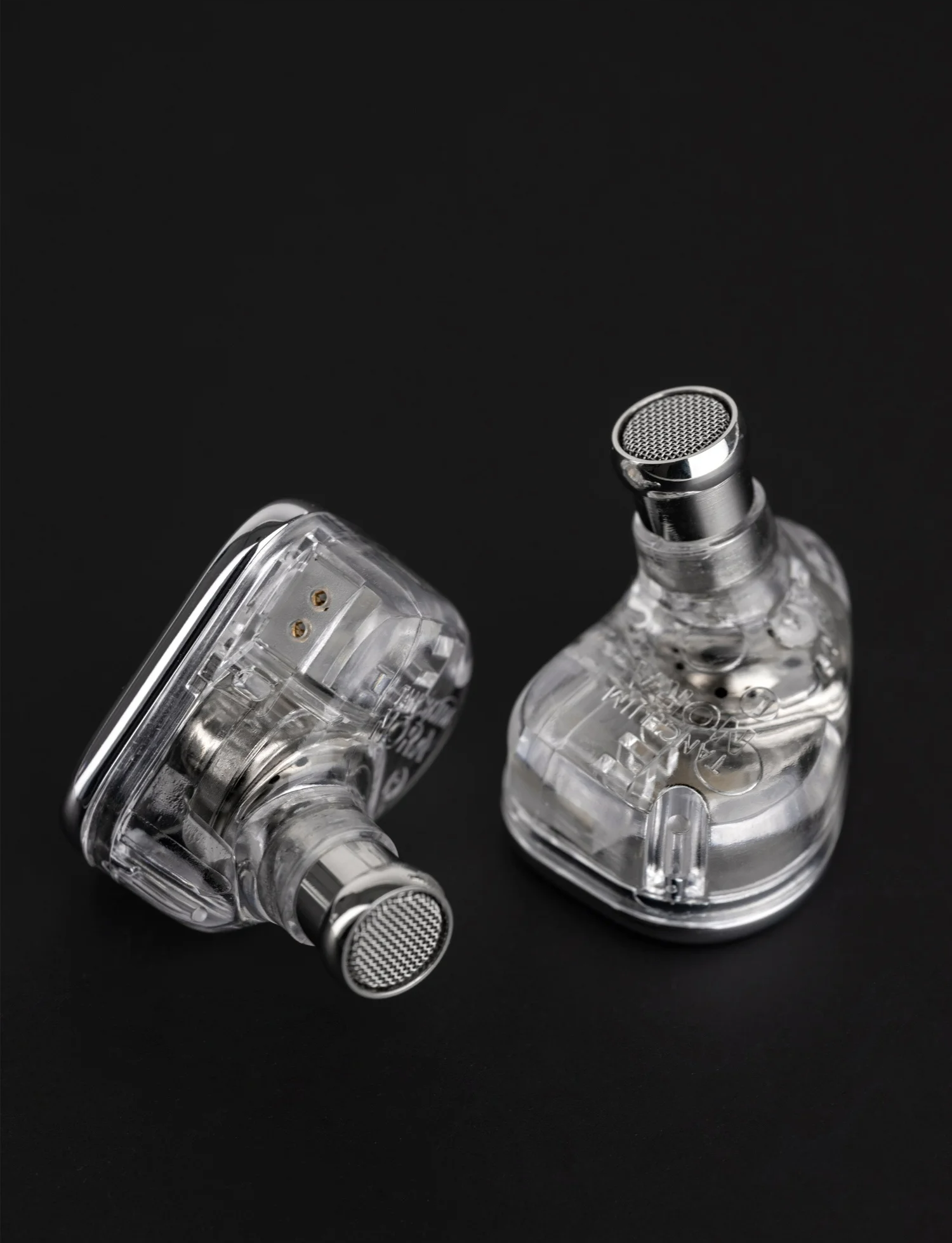 > The sound chamber is made from medical-grade transparent resin, while the front plate features a metal frame and sapphire glass - offering a snug, lightweight fit and a refinded, crystal-clear aesthetic.