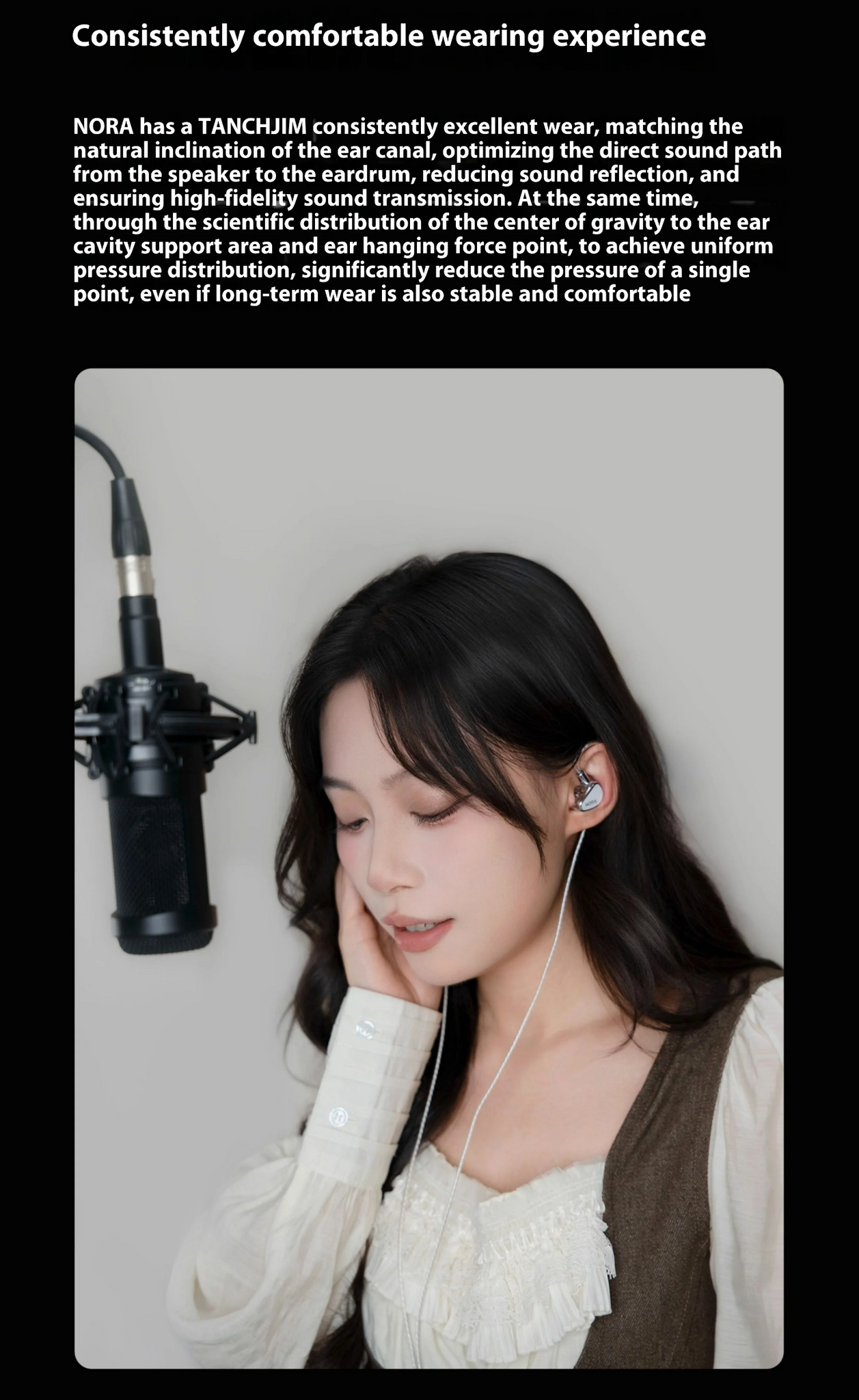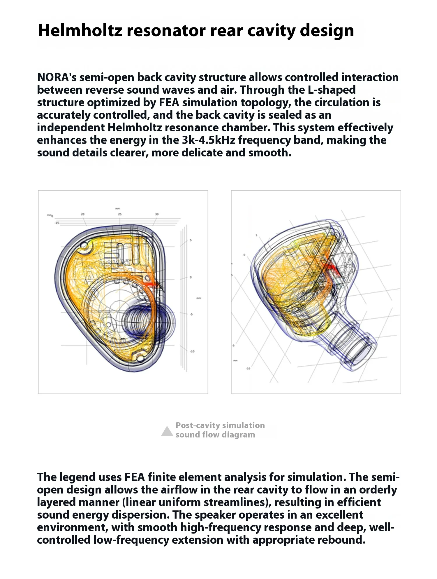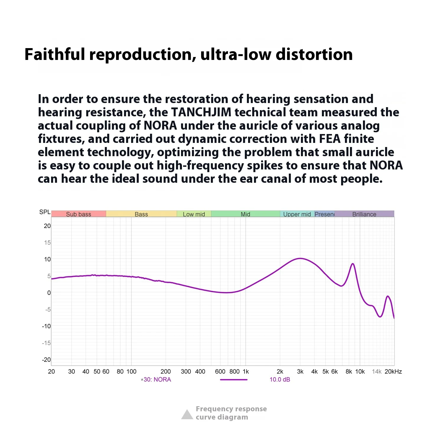 > Using FEA-based dynami correction and ear model testing, TANCHJIM optimized NORA to avoid harsh treble peaks in small ear canals - ensuring ideal comfortable sound for most listeners.