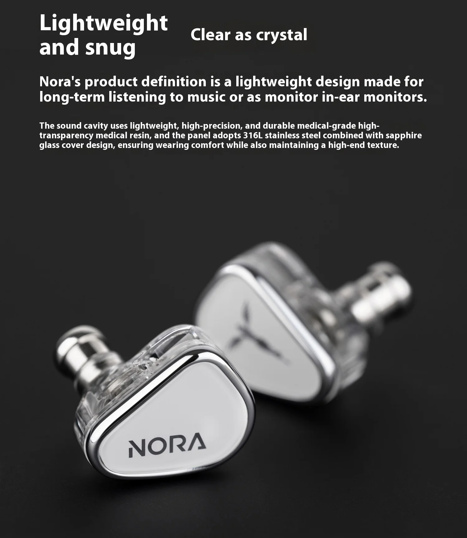 > Designed for long listening sessions and professional monitoring, NORA features a lightweight medical-grade resin cavity with 316L stainless steel and sapphire glass faceplate - offering lasting comfort and a refined, premium feel.