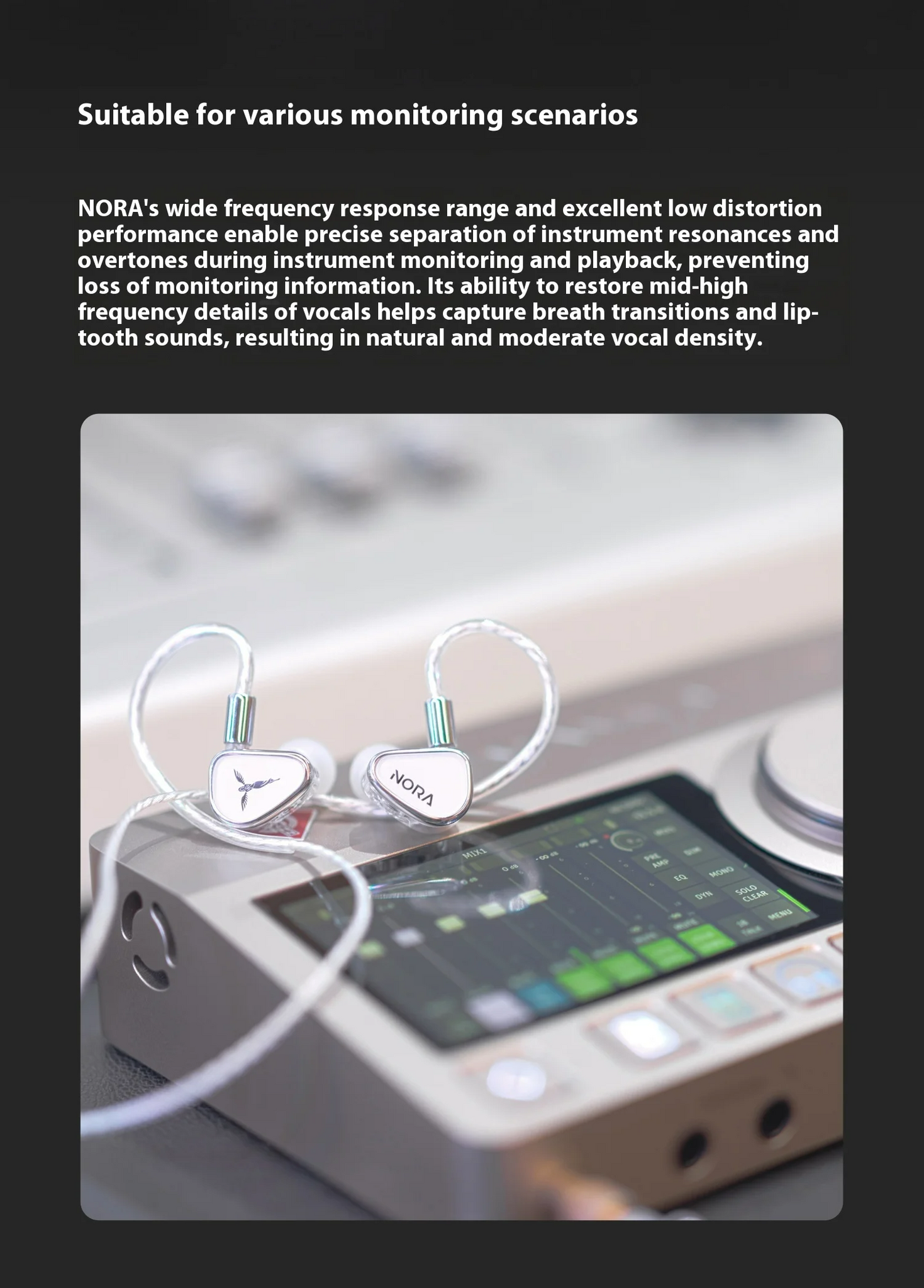 > Based on the balanced tuning favored by audiophiles, NORA enhances vocals and treble insturments for crisp, detailed, and fatigue-free sound. The lightweight, ergonomic design ensures lasting comfort for extended listening.