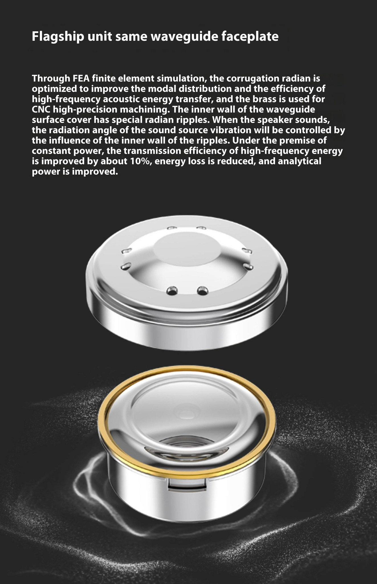 > Using finite element analysis (FEA), the waveguide's curved ripples are optimized to improve modal distribution and treble energy transmission. CNC-machined from brass, its special inner ripples control vibration angles, boosting treble effiecieny by ~10% without added power, reducing loss, and enhancing resolution.